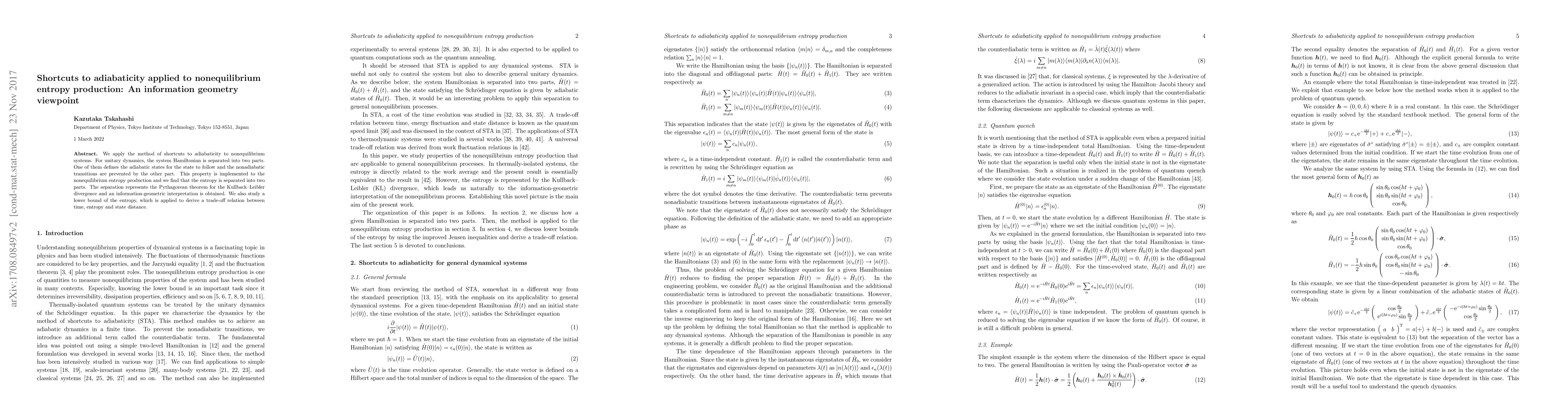 This paper applies shortcuts to adiabaticity to nonequilibrium systems, revealing a separation of entropy into two parts. An information-geometric interpretation is derived, showing the Pythagorean theorem for Kullback-Leibler divergence, and a trade-off relation between time, entropy, and state distance is established.
