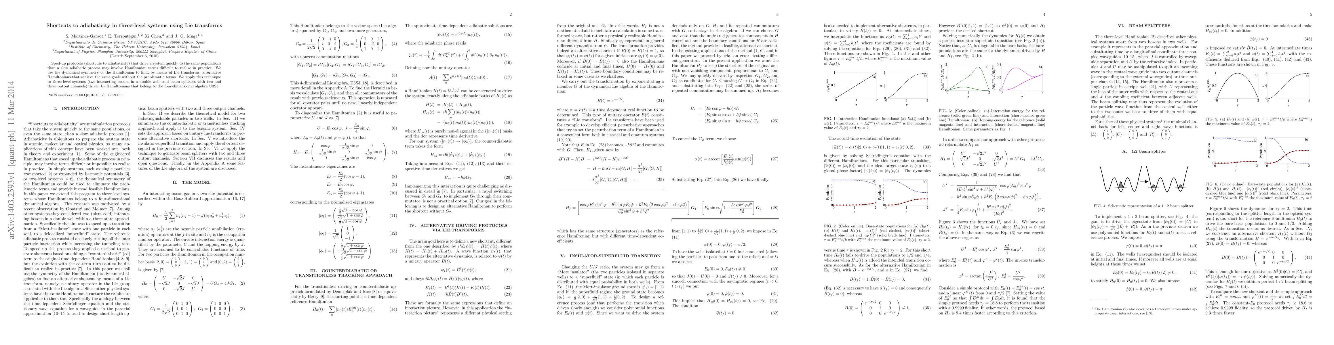This paper proposes using Lie transforms to develop shortcuts to adiabaticity for three-level systems, avoiding impractical Hamiltonian terms. The technique is applied to systems like two interacting bosons and beam splitters, leveraging the dynamical symmetry of their Hamiltonians.