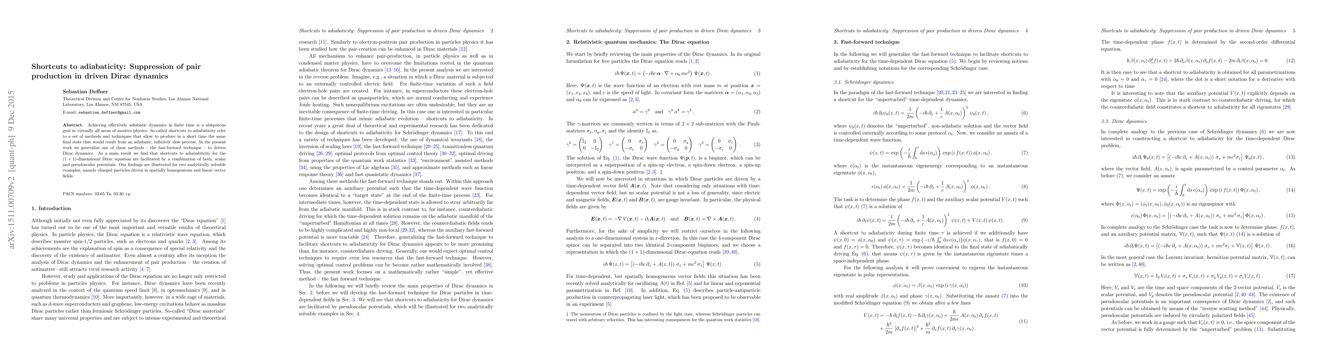 This paper explores methods to achieve effectively adiabatic dynamics in a finite time, specifically focusing on driven Dirac dynamics. The authors generalize the fast-forward technique to $(1+1)$-dimensional Dirac equations, showing that a combination of scalar and pseudoscalar potentials can suppress pair production and facilitate shortcuts to adiabaticity. Two analytically solvable examples are used to illustrate these findings.