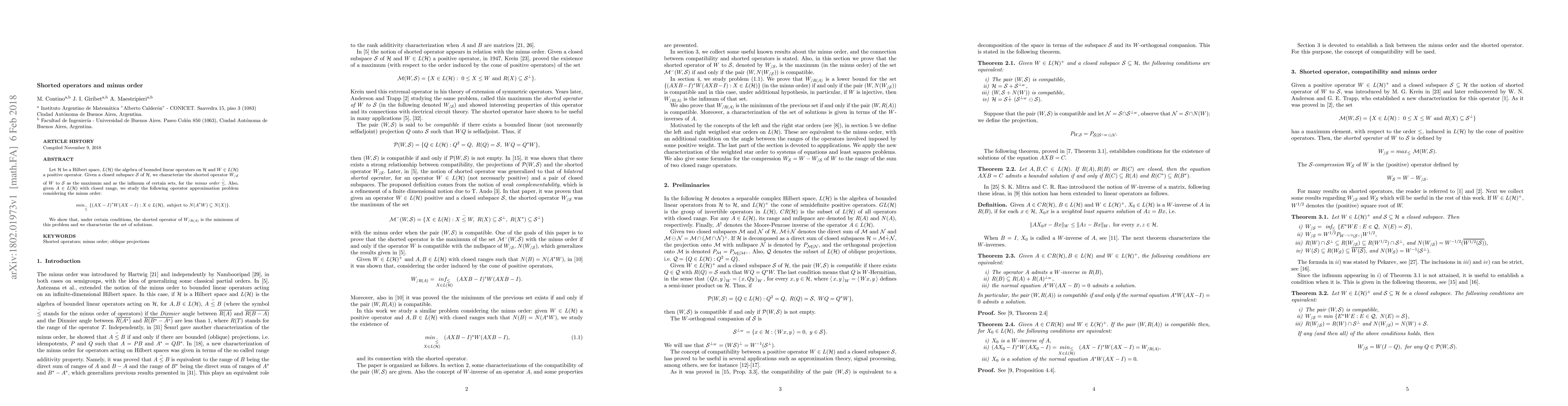 Let $\mathcal{H}$ be a Hilbert space, $L(\mathcal{H})$ the algebra of bounded linear operators on $\mathcal{H}$ and $W \in L(\mathcal{H})$ a positive operator. Given a closed subspace $\mathcal{S}$ of $\mathcal{H}$, we characterize the shorted operator $W_{/ \mathcal{S}}$ of $W$ to $\mathcal{S}$ as the maximum and as the infimum of certain sets, for the minus order $\stackrel{-}{\leq}.$ Also, given $A \in L(\mathcal{H})$ with closed range, we study the following operator approximation problem considering the minus order: $$ min_{\stackrel{-}{\leq}} \ \{(AX-I)^*W(AX-I) : X \in L(\mathcal{H}), \mbox{ subject to } N(A^*W)\subseteq N(X) \}. $$ We show that, under certain conditions, the shorted operator $W_{/R(A)}$ (of $W$ to the range of $A$) is the minimum of this problem and we characterize the set of solutions.