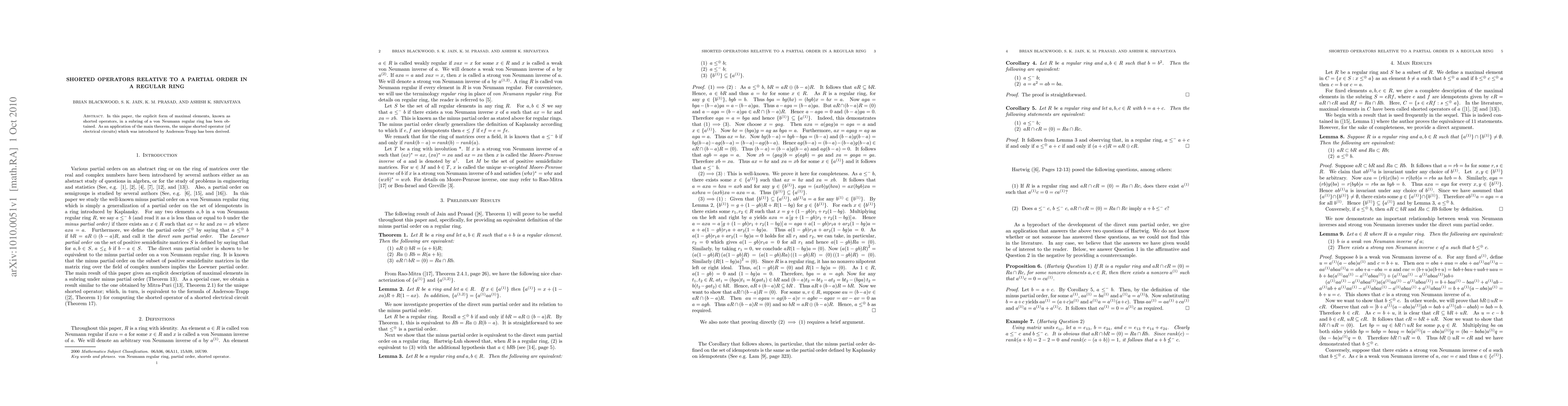 This paper derives the explicit form of maximal elements, termed shorted operators, in a subring of a von Neumann regular ring and applies this to derive the unique shorted operator introduced by Anderson-Trapp for electrical circuits.