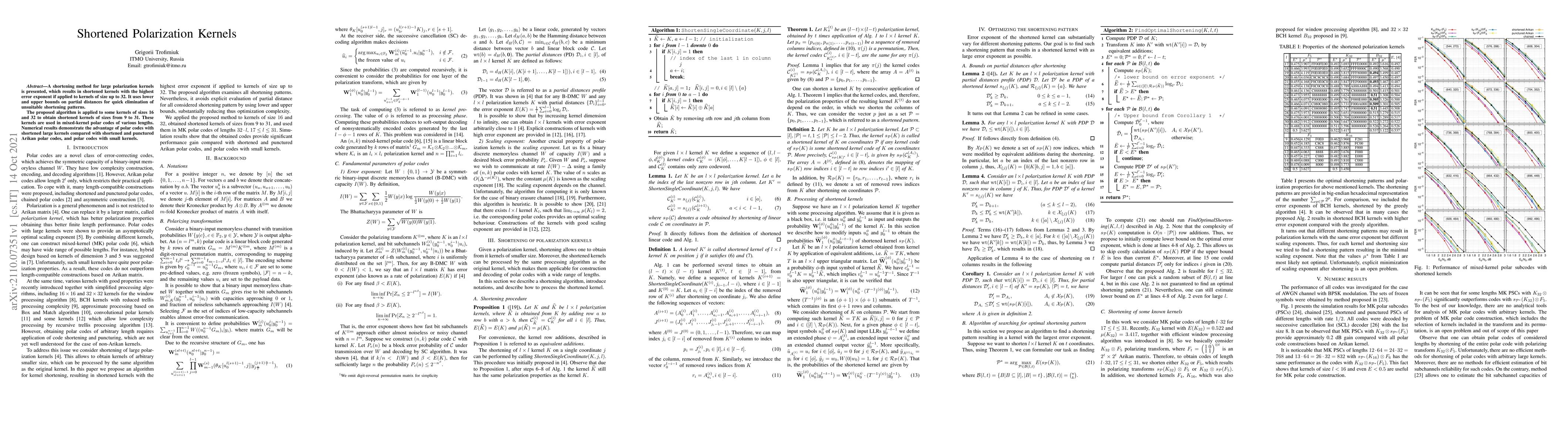 This paper presents a method to shorten large polarization kernels efficiently, achieving minimal error exponent for kernels up to size 32. The algorithm uses bounds on partial distances to quickly eliminate unsuitable patterns, resulting in kernels ranging from 9 to 31. Numerical results show that these shortened kernels improve performance in mixed-kernel polar codes compared to traditional shortened and punctured Arikan polar codes and small kernels.