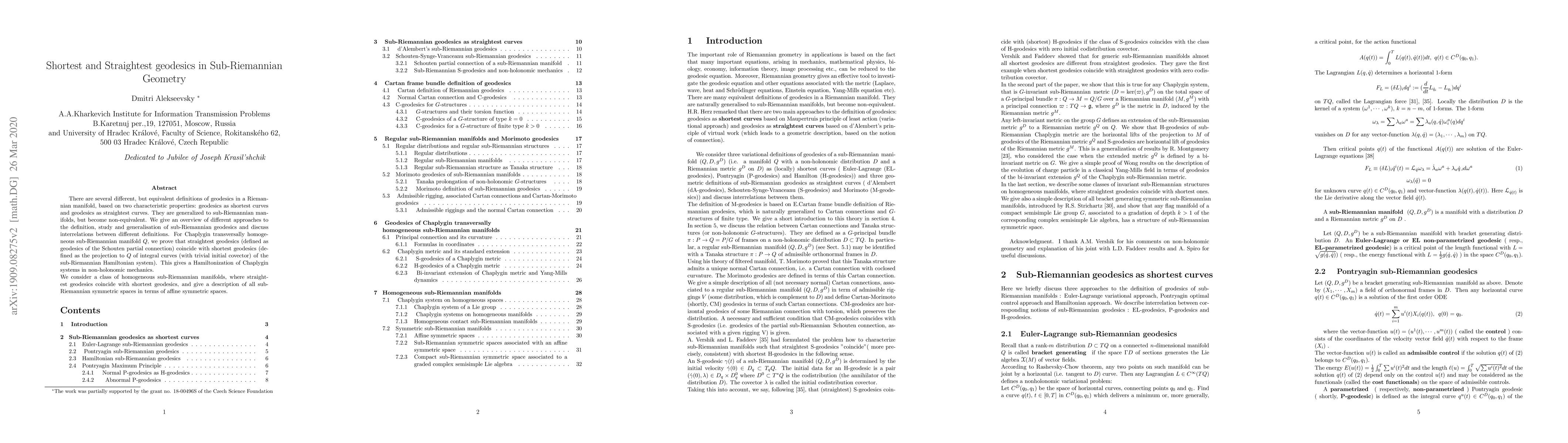 There are many equivalent definitions of Riemannian geodesics. They are naturally generalised to sub-Riemannian manifold, but become non-equivalent. We give a review of different definitions of geodesics of a sub-Riemannian manifold and interrelation between them. We recall three variational definitions of geodesics as (locally) shortest curves (Euler-Lagrange, Pontyagin and Hamilton) and three definitions of geodesics as straightest curves (d'Alembert , Levi-Civita-Schouten and Cartan-Tanaka ), used in nonholonomic mechanics and discuss their interrelations. We consider a big class of sub-Riemannian manifolds associated with principal bundle over a Riemannian manifolds, for which shortest geodesics coincides with straightest geodesics. Using the geometry of flag manifolds, we describe some classes of compact homogeneous sub-Riemannian manifolds (including contact sub-Riemannian manifolds and symmetric sub-Riemannian manifolds) where straightest geodesics coincides with shortest geodesics. Construction of geodesics in these cases reduces to description of Riemannian geodesics of the Riemannian homogeneous manifold or left-invariant metric on a Lie group.