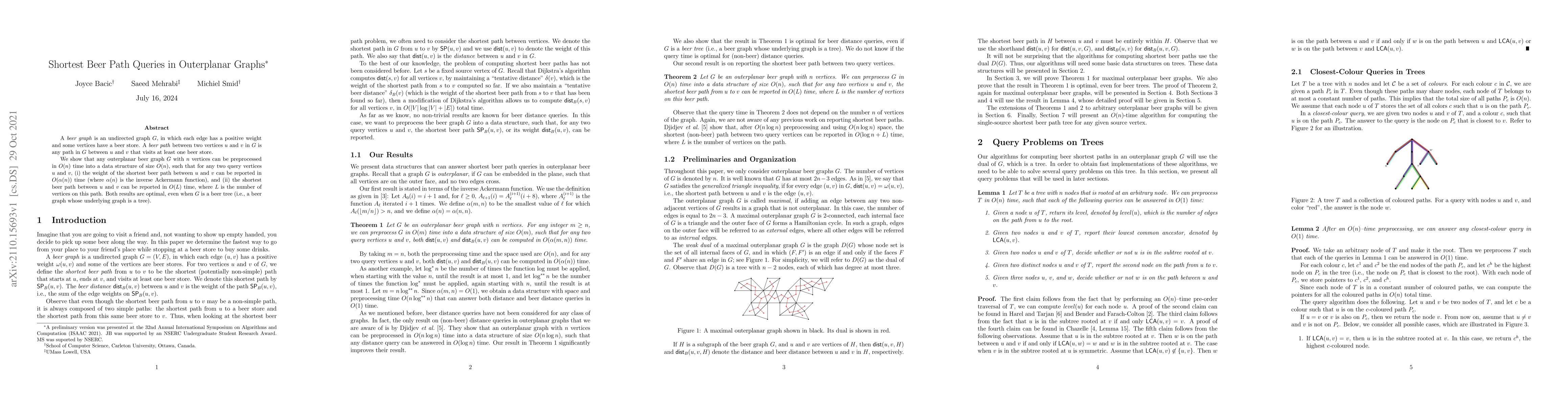 A \emph{beer graph} is an undirected graph $G$, in which each edge has a positive weight and some vertices have a beer store. A \emph{beer path} between two vertices $u$ and $v$ in $G$ is any path in $G$ between $u$ and $v$ that visits at least one beer store. We show that any outerplanar beer graph $G$ with $n$ vertices can be preprocessed in $O(n)$ time into a data structure of size $O(n)$, such that for any two query vertices $u$ and $v$, (i) the weight of the shortest beer path between $u$ and $v$ can be reported in $O(\alpha(n))$ time (where $\alpha(n)$ is the inverse Ackermann function), and (ii) the shortest beer path between $u$ and $v$ can be reported in $O(L)$ time, where $L$ is the number of vertices on this path. Both results are optimal, even when $G$ is a beer tree (i.e., a beer graph whose underlying graph is a tree).