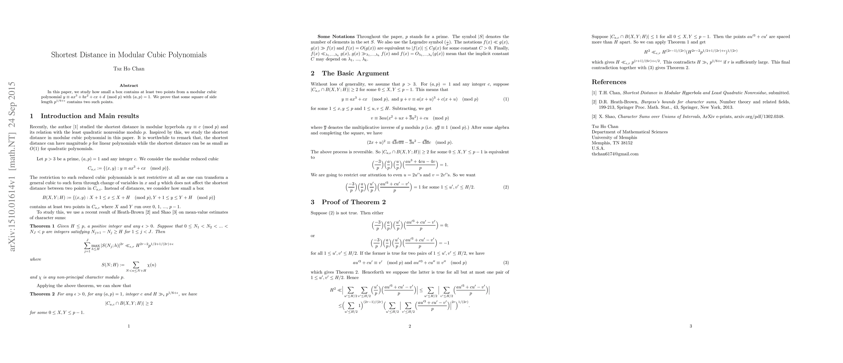 This paper investigates the minimum size of a box that must contain at least two points from a modular cubic polynomial $y \equiv a x^3 + b x^2 + c x + d \pmod p$. It proves that a square of side length $p^{1/6 + \epsilon}$ suffices to guarantee this containment.