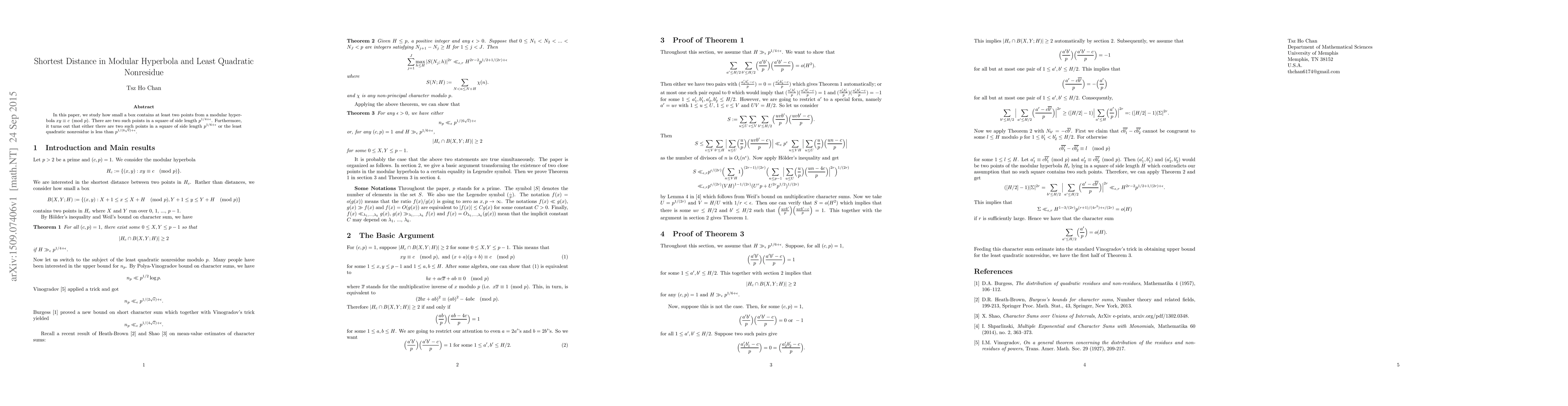 In this paper, we study how small a box contains at least two points from a modular hyperbola $x y \equiv c \pmod p$. There are two such points in a square of side length $p^{1/4 + \epsilon}$. Furthermore, it turns out that either there are two such points in a square of side length $p^{1/6 + \epsilon}$ or the least quadratic nonresidue is less than $p^{1/(6 \sqrt{e}) + \epsilon}$.