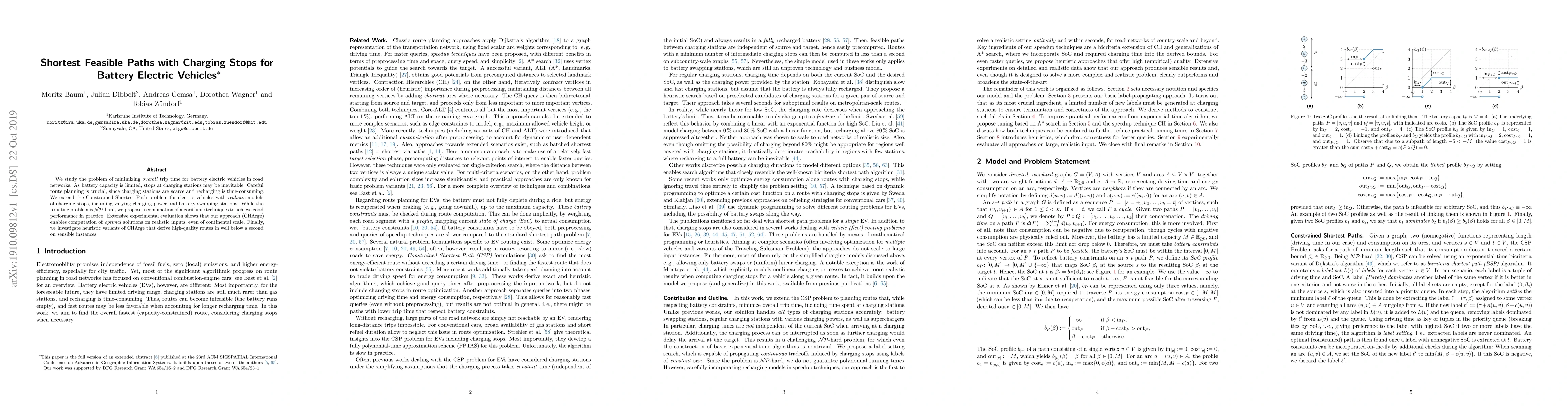 This paper addresses the optimization of trip time for battery electric vehicles by incorporating charging stops into route planning. It proposes a combination of algorithmic techniques to solve the NP-hard problem of finding the shortest feasible paths with charging stops, demonstrating optimal solution computation and efficient heuristics for practical use.