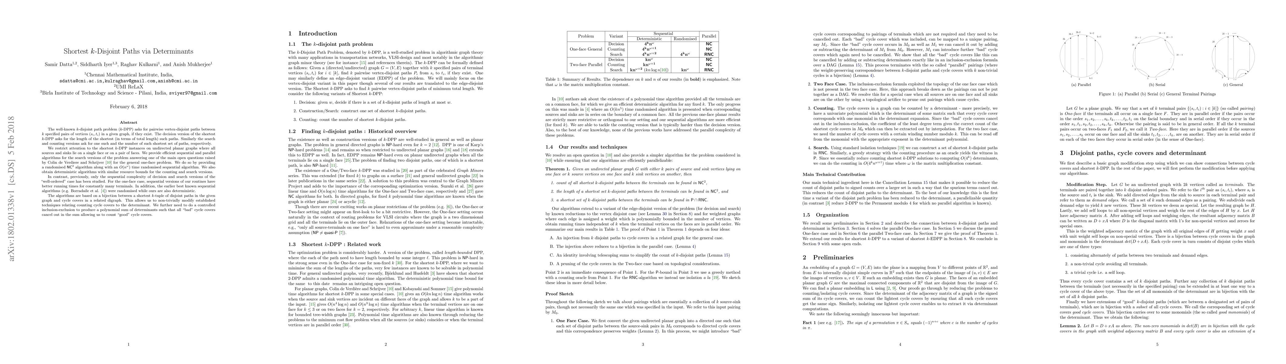 The well-known $k$-disjoint path problem ($k$-DPP) asks for pairwise vertex-disjoint paths between $k$ specified pairs of vertices $(s_i, t_i)$ in a given graph, if they exist. The decision version of the shortest $k$-DPP asks for the length of the shortest (in terms of total length) such paths. Similarly the search and counting versions ask for one such and the number of such shortest set of paths, respectively. We restrict attention to the shortest $k$-DPP instances on undirected planar graphs where all sources and sinks lie on a single face or on a pair of faces. We provide efficient sequential and parallel algorithms for the search versions of the problem answering one of the main open questions raised by Colin de Verdiere and Schrijver for the general one-face problem. We do so by providing a randomised $NC^2$ algorithm along with an $O(n^{\omega})$ time randomised sequential algorithm. We also obtain deterministic algorithms with similar resource bounds for the counting and search versions. In contrast, previously, only the sequential complexity of decision and search versions of the "well-ordered" case has been studied. For the one-face case, sequential versions of our routines have better running times for constantly many terminals. In addition, the earlier best known sequential algorithms (e.g. Borradaile et al.) were randomised while ours are also deterministic. The algorithms are based on a bijection between a shortest $k$-tuple of disjoint paths in the given graph and cycle covers in a related digraph. This allows us to non-trivially modify established techniques relating counting cycle covers to the determinant. We further need to do a controlled inclusion-exclusion to produce a polynomial sum of determinants such that all "bad" cycle covers cancel out in the sum allowing us to count "good" cycle covers.