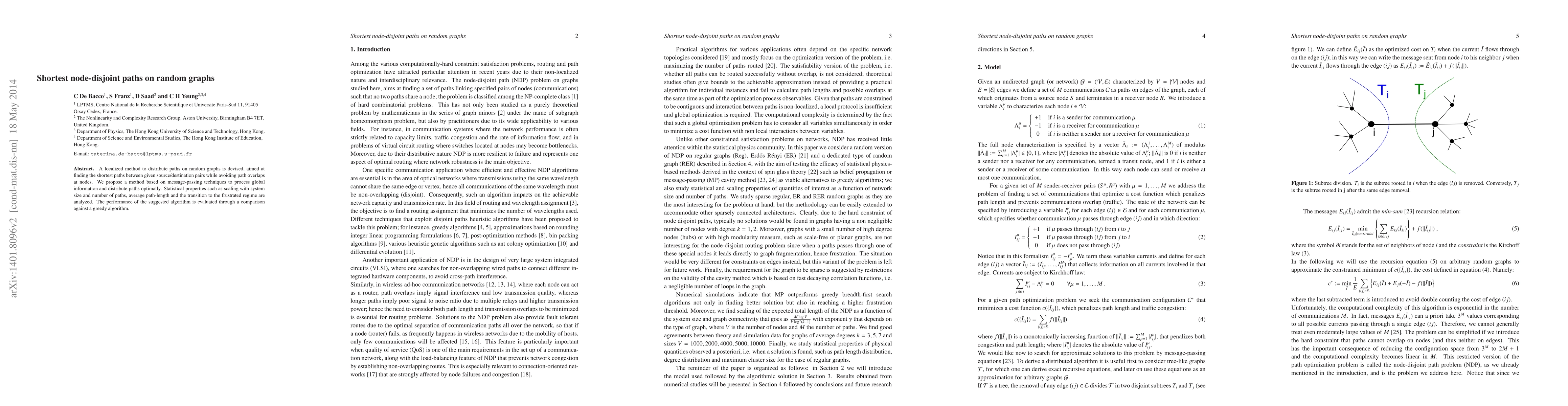 This paper proposes a localized method for finding the shortest node-disjoint paths on random graphs using message-passing techniques, analyzing statistical properties and comparing its performance against a greedy algorithm. The method aims to optimize path distribution while avoiding node overlaps.