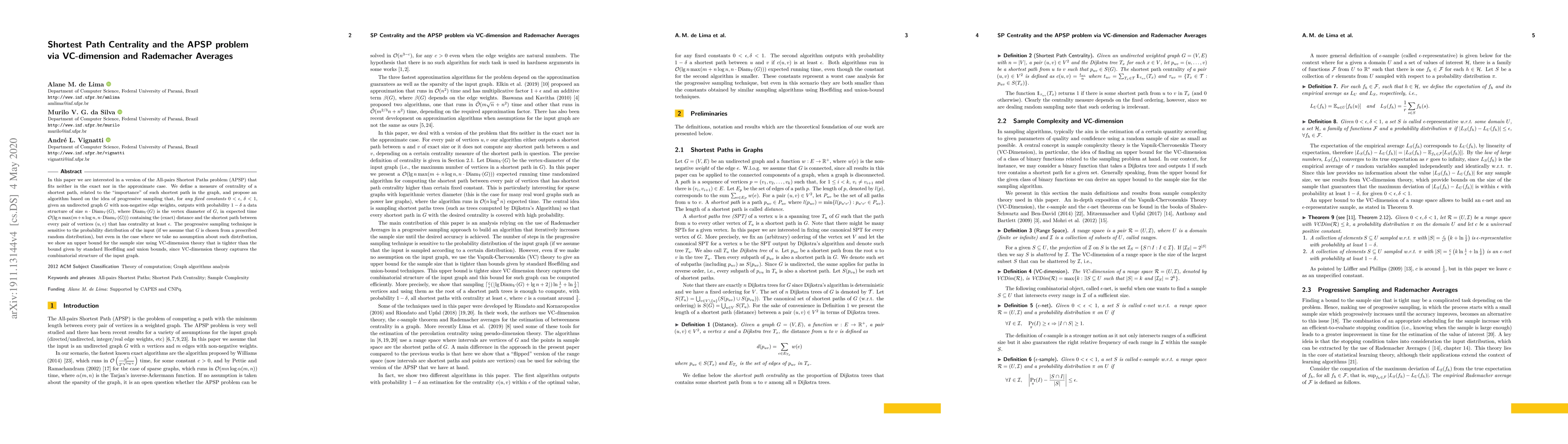 In this paper we are interested in a version of the All-pairs Shortest Paths problem (APSP) that fits neither in the exact nor in the approximate case. We define a measure of centrality of a shortest path, related to the ``importance'' of such shortest path in the graph, and propose an algorithm based on the idea of progressive sampling that, for {\it any fixed constants} $0 < \epsilon$, $ \delta < 1$, given an undirected graph $G$ with non-negative edge weights, outputs with probability $1 - \delta$ a data structure of size $n \cdot \textrm{Diam}_V(G)$, where $\textrm{Diam}_V(G)$ is the vertex diameter of $G$, in expected time $\mathcal{O}(\lg n \max(m + n \log n, n \cdot \textrm{Diam}_V(G)))$ containing the (exact) distance and the shortest path between every pair of vertices $(u,v)$ that has centrality at least $\epsilon$. The progressive sampling technique is sensitive to the probability distribution of the input (if we assume that $G$ is chosen from a prescribed random distribution), but even in the case where we take no assumption about such distribution, we show an upper bound for the sample size using VC-dimension theory that is tighter than the bound given by standard Hoeffding and union bounds, since VC-dimension theory captures the combinatorial structure of the input graph.