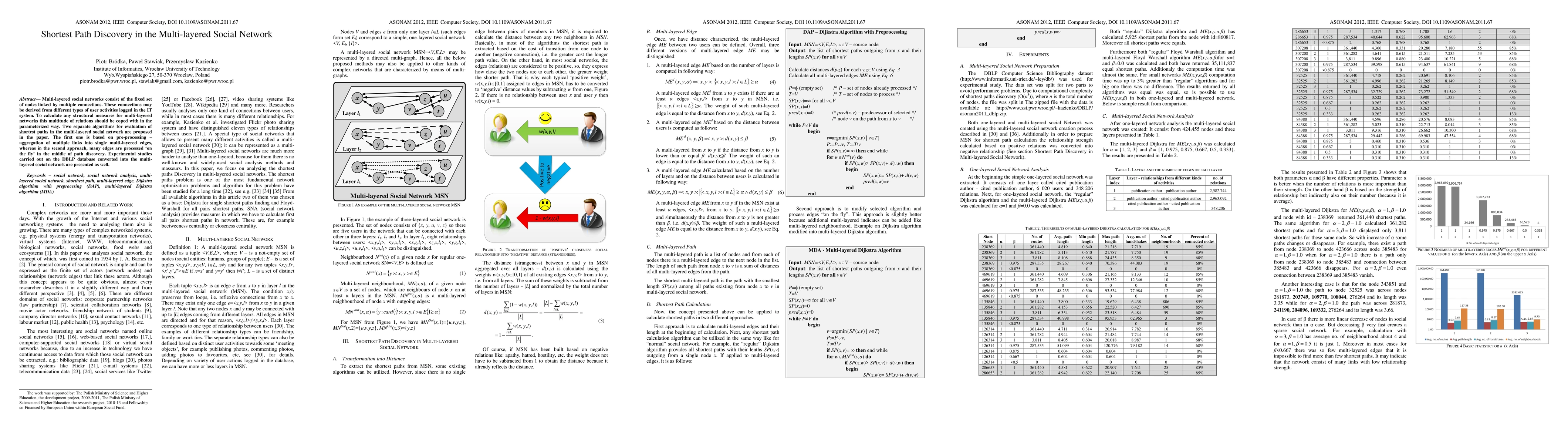 This paper proposes two algorithms for discovering shortest paths in multi-layered social networks, where connections are derived from various user activities. The first algorithm aggregates multiple links into single edges before processing, while the second processes many edges dynamically during path discovery. Experimental results on a DBLP database converted into a multi-layered network are presented.
