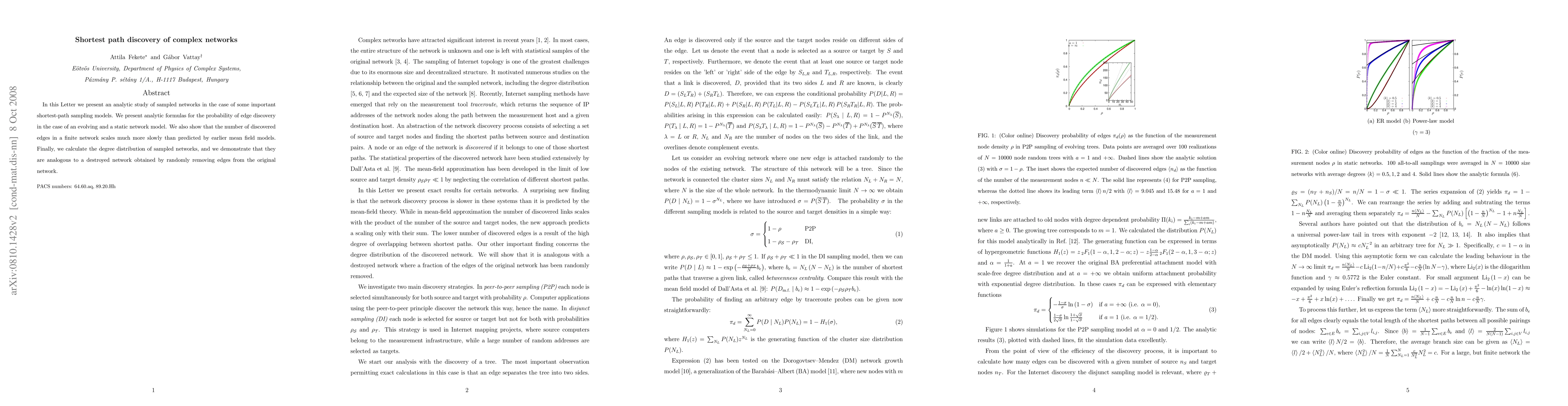 In this paper we present an analytic study of sampled networks in the case of some important shortest-path sampling models. We present analytic formulas for the probability of edge discovery in the case of an evolving and a static network model. We also show that the number of discovered edges in a finite network scales much slower than predicted by earlier mean field models. Finally, we calculate the degree distribution of sampled networks, and we demonstrate that they are analogous to a destructed network obtained by randomly removing edges from the original network.