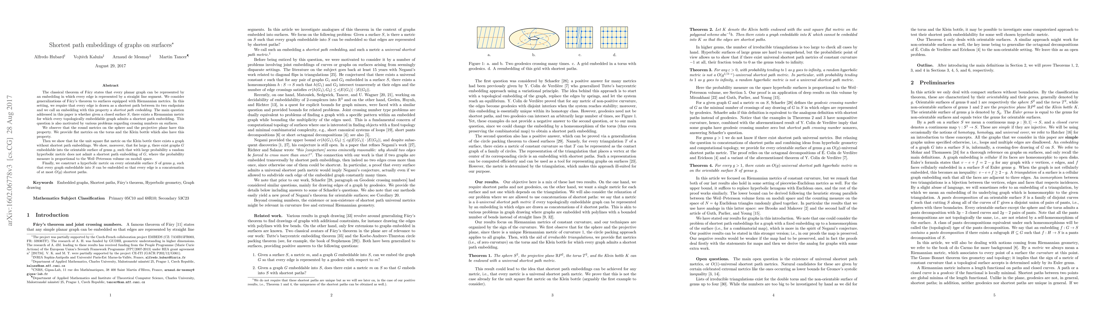 The classical theorem of F\'{a}ry states that every planar graph can be represented by an embedding in which every edge is represented by a straight line segment. We consider generalizations of F\'{a}ry's theorem to surfaces equipped with Riemannian metrics. In this setting, we require that every edge is drawn as a shortest path between its two endpoints and we call an embedding with this property a shortest path embedding. The main question addressed in this paper is whether given a closed surface S, there exists a Riemannian metric for which every topologically embeddable graph admits a shortest path embedding. This question is also motivated by various problems regarding crossing numbers on surfaces. We observe that the round metrics on the sphere and the projective plane have this property. We provide flat metrics on the torus and the Klein bottle which also have this property. Then we show that for the unit square flat metric on the Klein bottle there exists a graph without shortest path embeddings. We show, moreover, that for large g, there exist graphs G embeddable into the orientable surface of genus g, such that with large probability a random hyperbolic metric does not admit a shortest path embedding of G, where the probability measure is proportional to the Weil-Petersson volume on moduli space. Finally, we construct a hyperbolic metric on every orientable surface S of genus g, such that every graph embeddable into S can be embedded so that every edge is a concatenation of at most O(g) shortest paths.