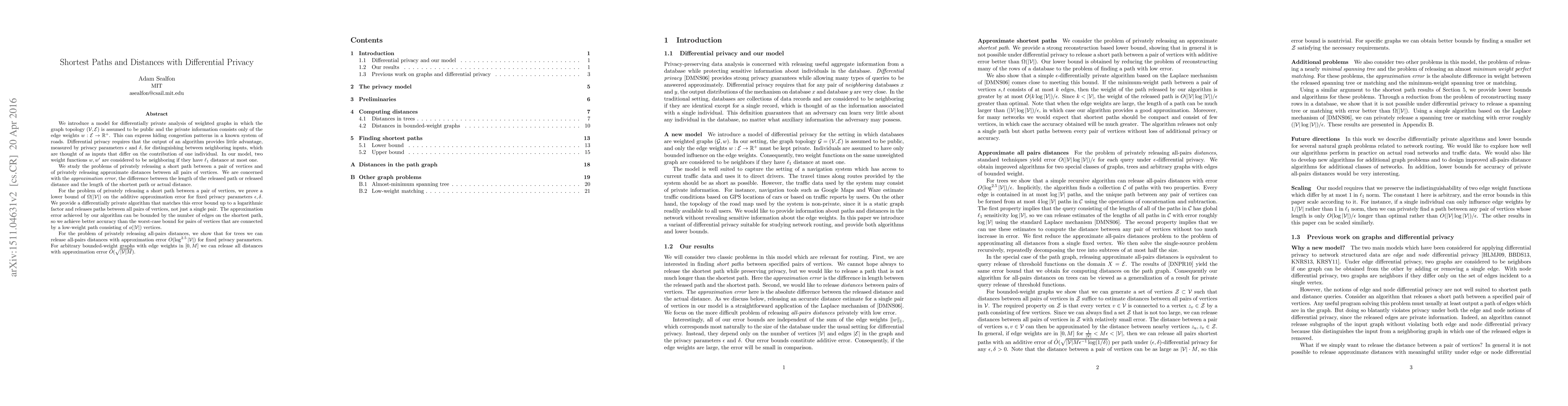 This paper introduces a differentially private model for analyzing weighted graphs, focusing on protecting edge weights while maintaining public graph topology. It presents algorithms for privately releasing short paths and approximate distances between vertices, achieving optimal error bounds for specific graph structures.