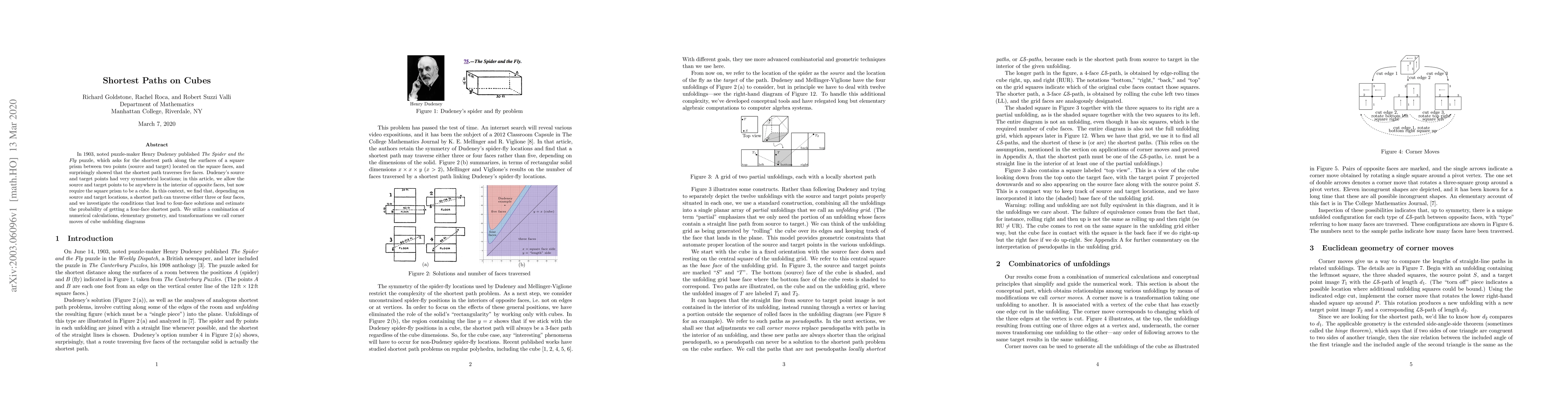 Researchers investigate shortest paths on a cube between two points on opposite faces, finding that paths can either traverse 3 or 4 faces depending on location, with a focus on understanding conditions for 4-face solutions and their probability.