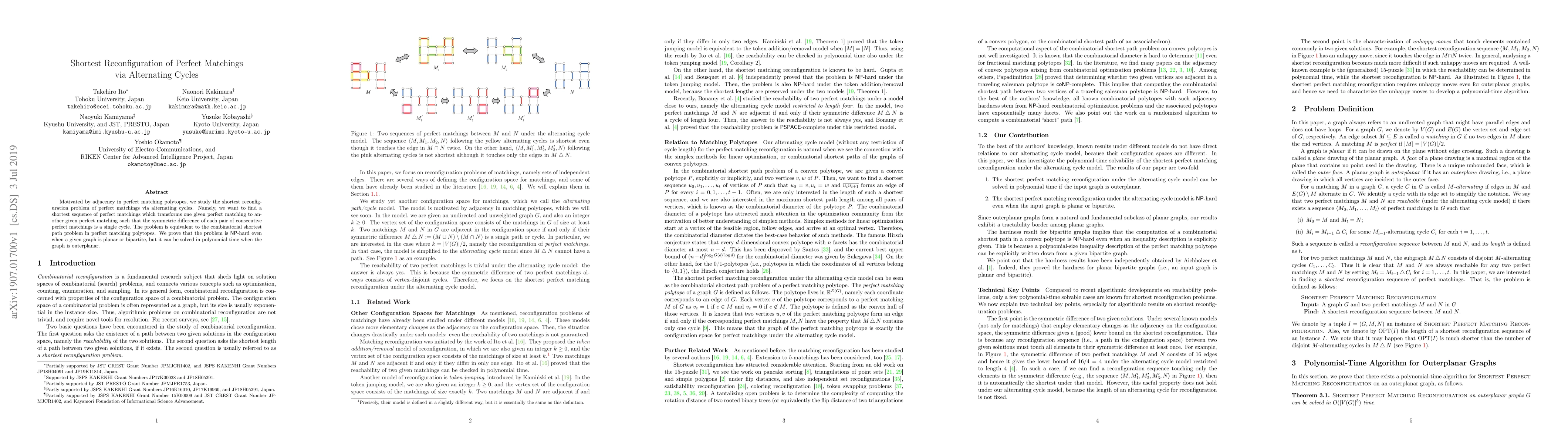 This paper investigates the shortest reconfiguration sequence of perfect matchings using alternating cycles, demonstrating its NP-hardness for planar or bipartite graphs but solvability in polynomial time for outerplanar graphs. The problem is equivalent to the combinatorial shortest path in perfect matching polytopes.