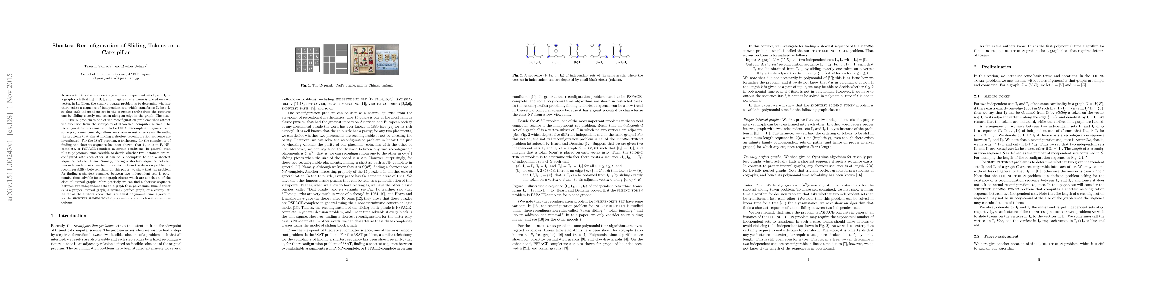 This paper investigates the shortest reconfiguration sequence of sliding tokens on a caterpillar graph, demonstrating that finding the shortest sequence between two independent sets is polynomial time solvable for proper interval graphs, trivially perfect graphs, and caterpillars. This is the first polynomial time algorithm for the shortest sliding token problem on a graph class requiring detours.