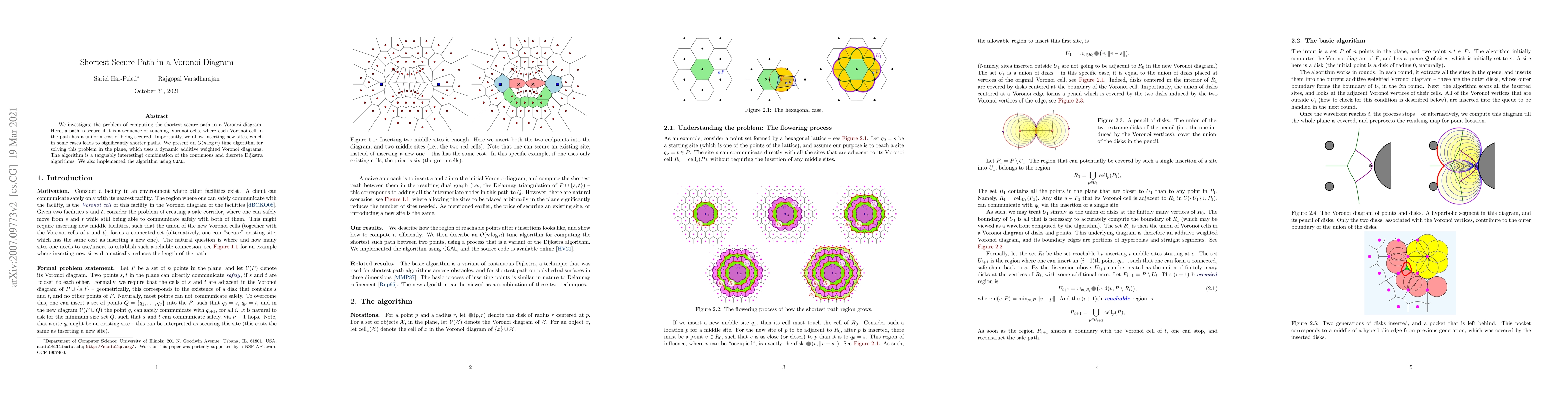 We investigate the problem of computing the shortest secure path in a Voronoi diagram. Here, a path is secure if it is a sequence of touching Voronoi cells, where each Voronoi cell in the path has a uniform cost of being secured. Importantly, we allow inserting new sites, which in some cases leads to significantly shorter paths. We present an $O(n \log n)$ time algorithm for solving this problem in the plane, which uses a dynamic additive weighted Voronoi diagram to compute this path. The algorithm is an interesting combination of the continuous and discrete Dijkstra algorithms. We also implemented the algorithm using CGAL.
