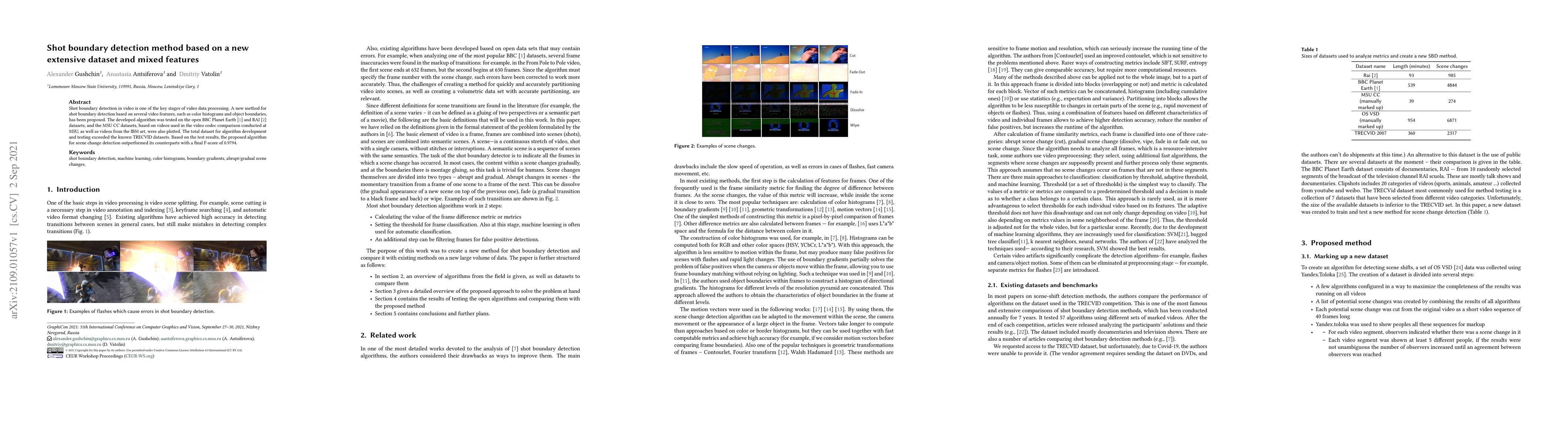 Shot boundary detection in video is one of the key stages of video data processing. A new method for shot boundary detection based on several video features, such as color histograms and object boundaries, has been proposed. The developed algorithm was tested on the open BBC Planet Earth [1] and RAI [2] datasets, and the MSU CC datasets, based on videos used in the video codec comparison conducted at MSU, as well as videos from the IBM set, were also plotted. The total dataset for algorithm development and testing exceeded the known TRECVID datasets. Based on the test results, the proposed algorithm for scene change detection outperformed its counterparts with a final F-score of 0.9794.