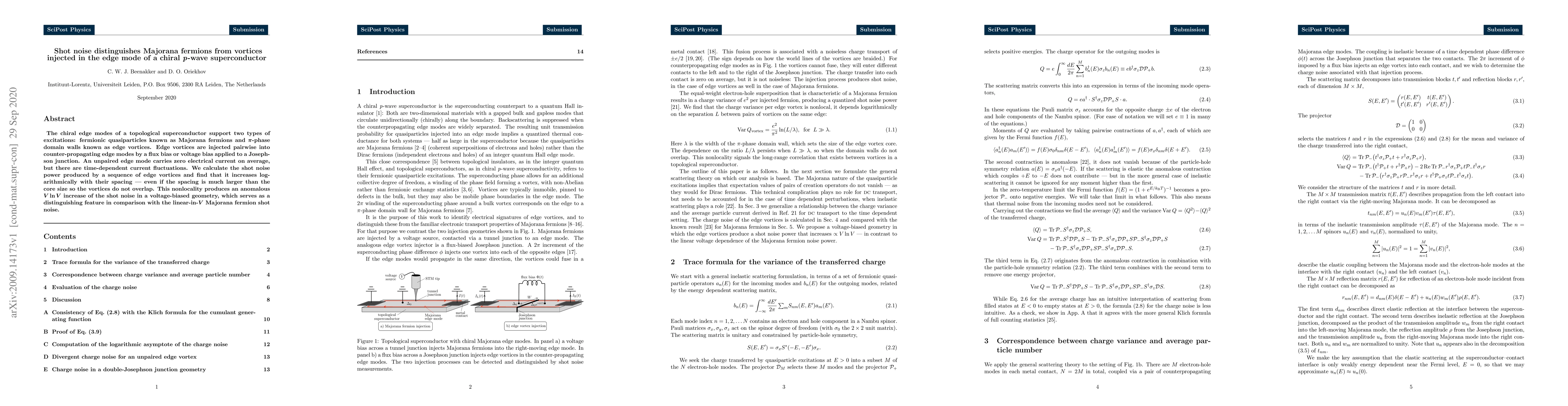 This paper investigates how shot noise can differentiate Majorana fermions from edge vortices in chiral p-wave superconductors. It finds that edge vortices produce a logarithmically increasing shot noise with spacing, leading to an anomalous V log V increase, distinguishing it from the linear-in-V shot noise characteristic of Majorana fermions.
