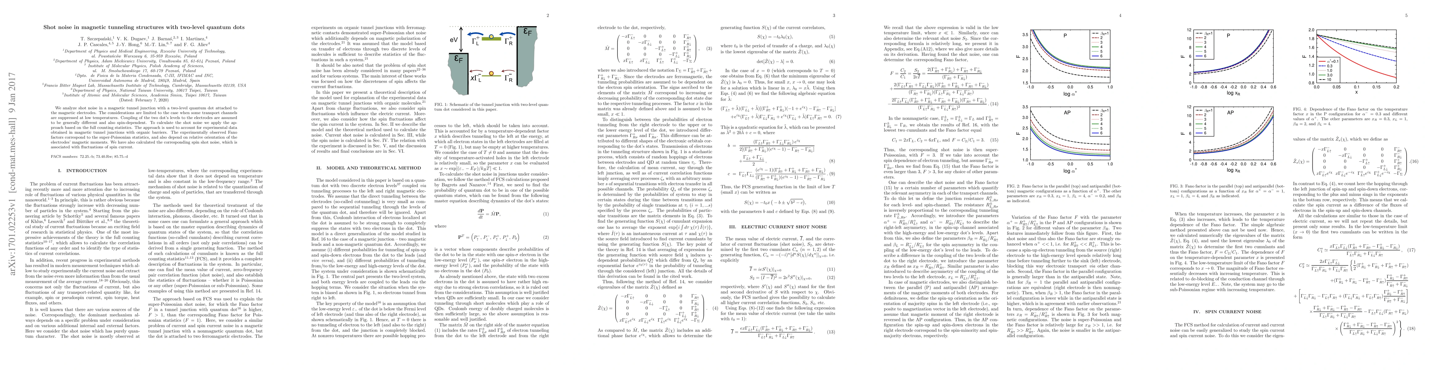 This paper investigates shot noise in magnetic tunnel junctions with a two-level quantum dot, focusing on conditions where transport channels are suppressed at low temperatures. The study employs full counting statistics to analyze the noise, revealing super-Poissonian statistics and spin-dependent fluctuations in spin current, with Fano factors influenced by the magnetic moments' orientation.