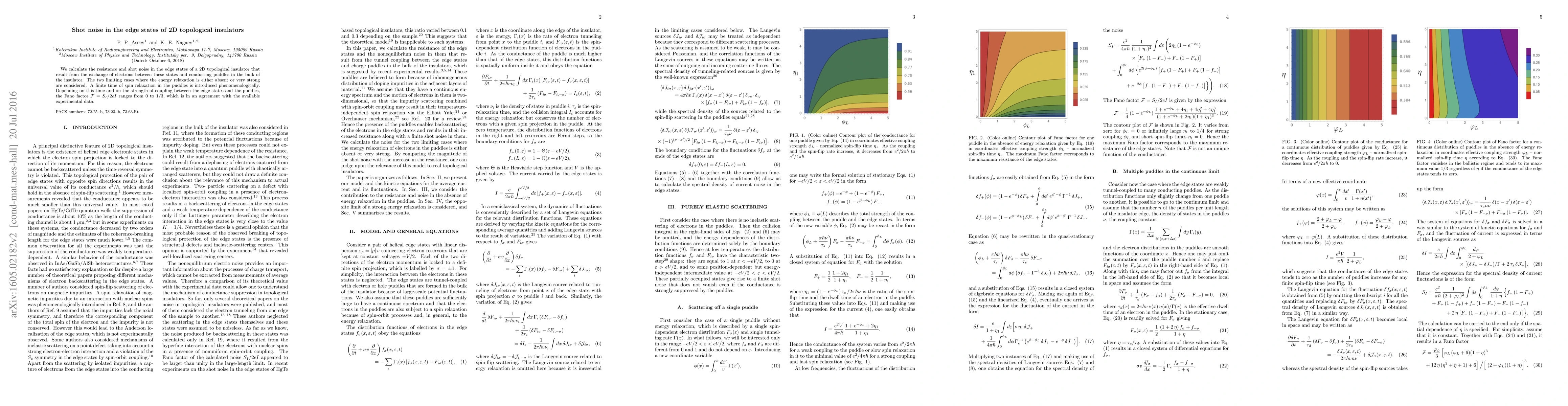 This paper investigates the resistance and shot noise in the edge states of 2D topological insulators due to electron exchange with bulk conducting puddles. The Fano factor, ranging from 0 to 1/3, is analyzed under varying conditions of spin relaxation time and coupling strength, aligning with experimental observations.
