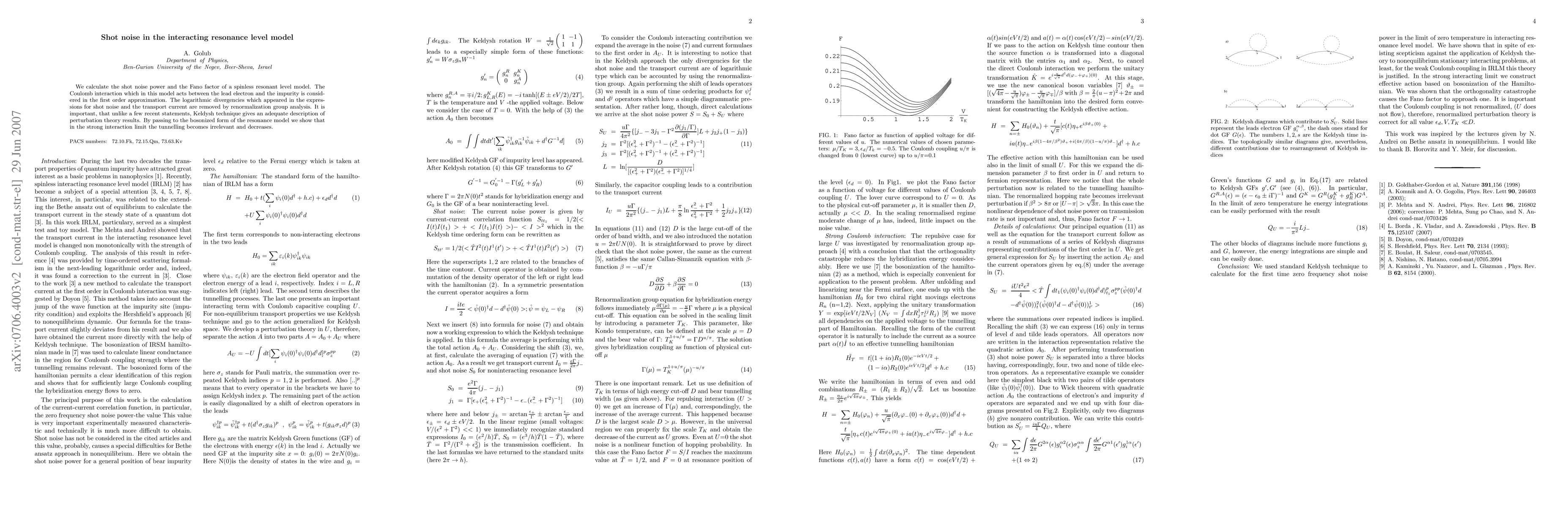 This paper calculates shot noise power and the Fano factor in a spinless resonant level model with Coulomb interaction, using renormalization group analysis to remove logarithmic divergencies. It demonstrates that the Keldysh technique aligns with perturbation theory results and shows that strong interaction reduces tunneling.