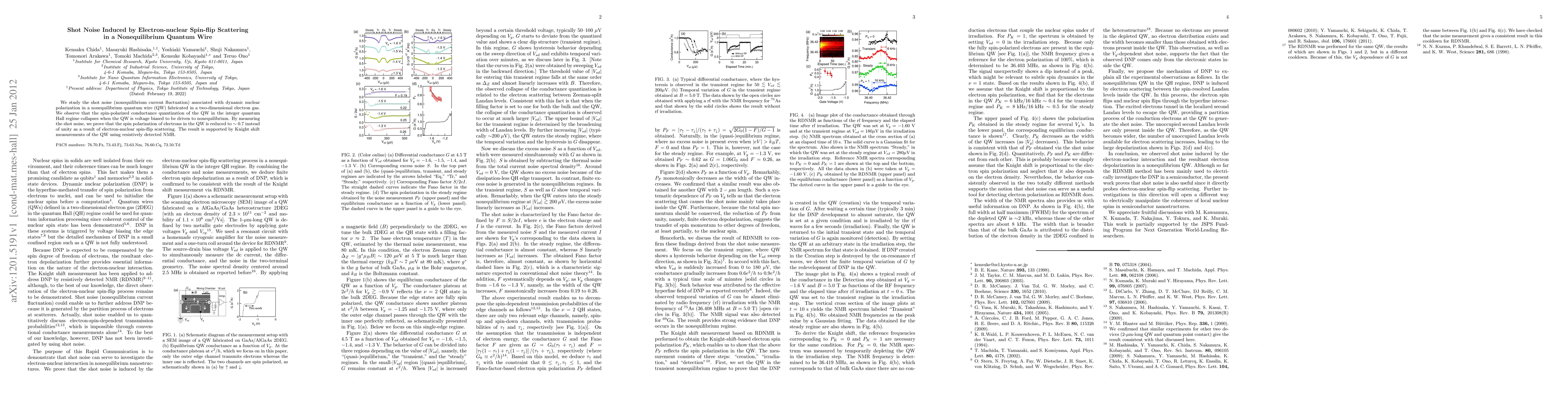 This paper investigates shot noise in a nonequilibrium quantum wire, revealing that electron-nuclear spin-flip scattering reduces electron spin polarization to ~0.7 from unity. The study supports this finding with Knight shift measurements using resistively detected NMR.