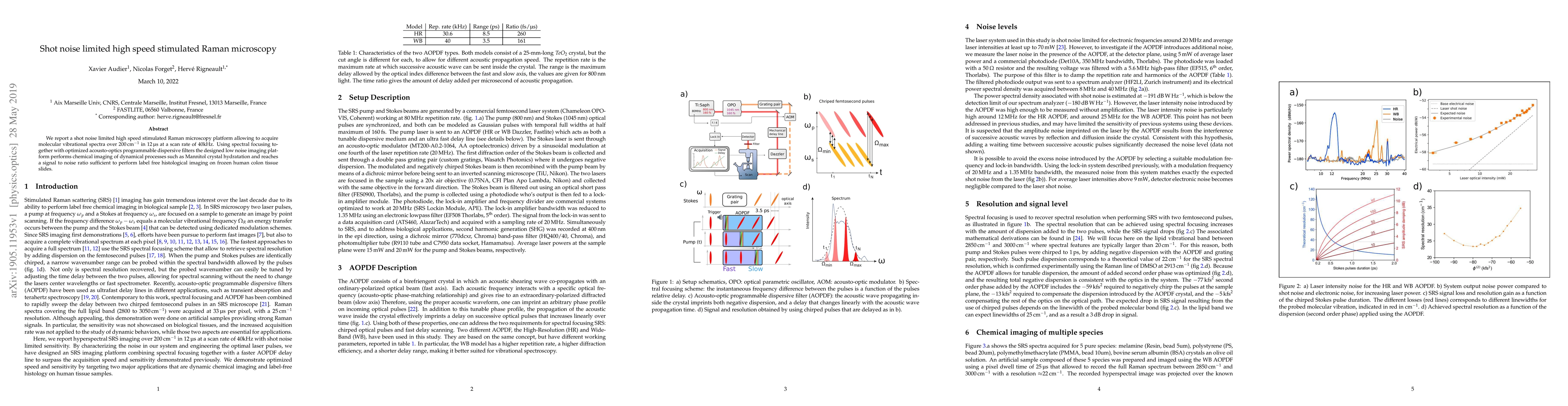 We report a shot noise limited high speed stimulated Raman microscopy platform allowing to acquire molecular vibrational spectra over \SI{200}{\per \cm} in \SI{12}{\micro \second} at a scan rate of 40kHz. Using spectral focusing together with optimized acousto-optics programmable dispersive filters the designed low noise imaging platform performs chemical imaging of dynamical processes such as Mannitol crystal hydratation and reaches a signal to noise ratio sufficient to perform label free histological imaging on frozen human colon tissue slides.
