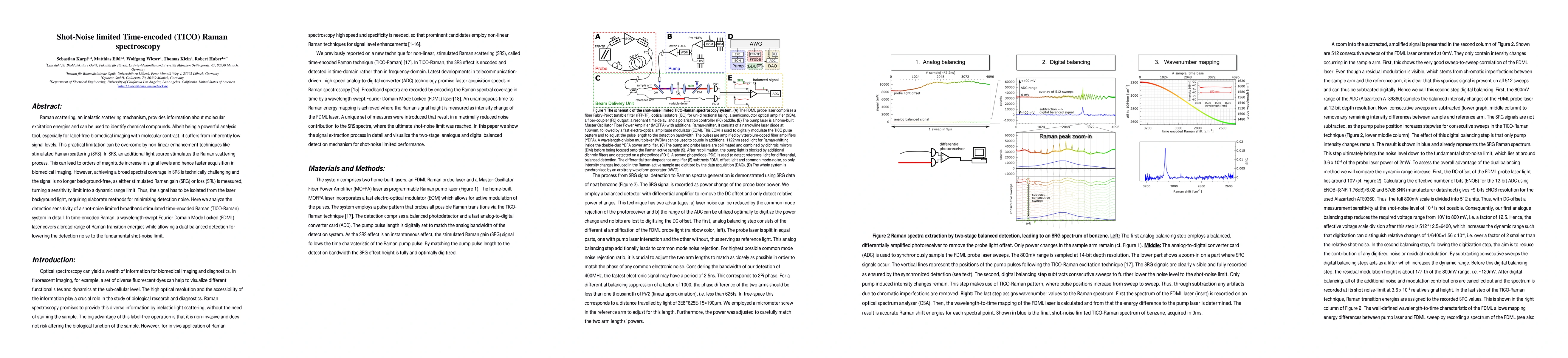 The research details a shot-noise limited broadband stimulated time-encoded Raman (TICO-Raman) system, utilizing a wavelength-swept Fourier Domain Mode Locked (FDML) laser and dual-balanced detection to lower noise to the fundamental shot-noise limit, enabling accurate Raman spectra recording with precise Raman transition energy values.