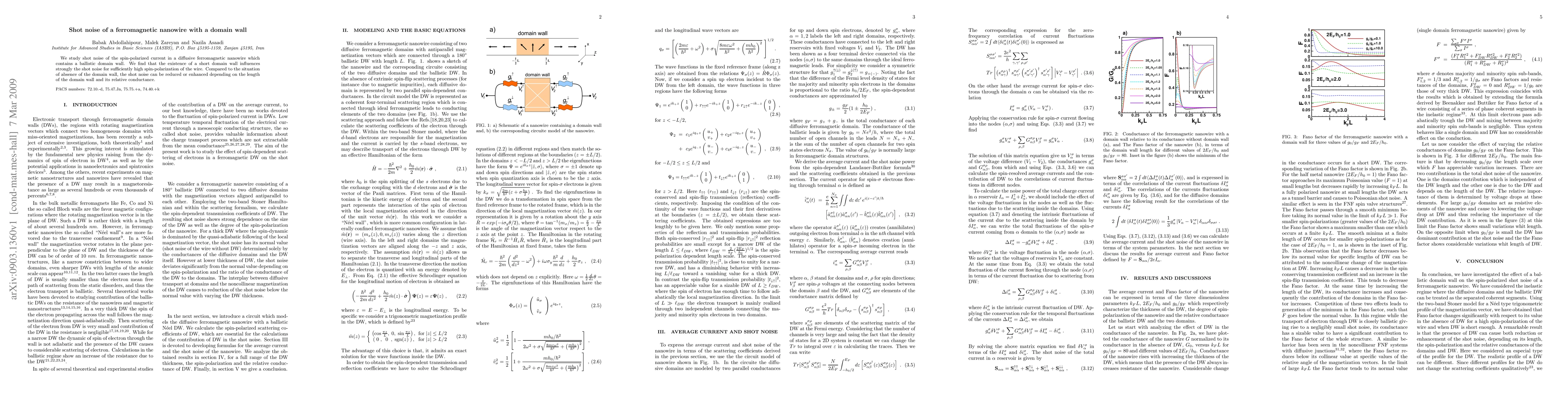 This study investigates shot noise in spin-polarized current through a ferromagnetic nanowire with a ballistic domain wall, finding that the domain wall's length and conductance significantly affect the shot noise, potentially reducing or enhancing it based on specific conditions.