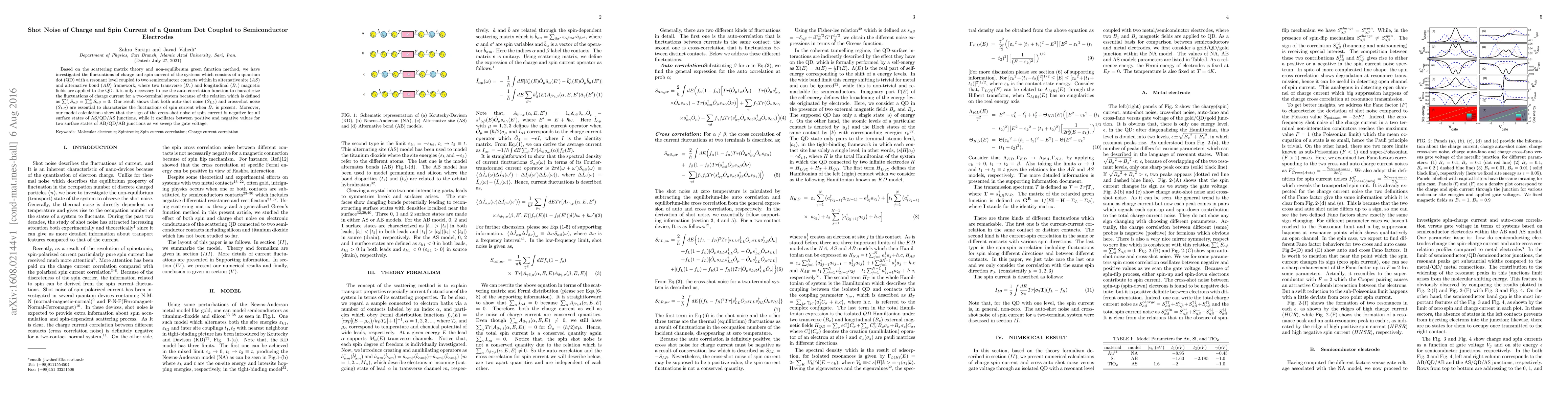This paper investigates the shot noise of charge and spin currents in a quantum dot coupled to semiconductor electrodes, revealing that both auto-shot noise and cross-shot noise are crucial for characterizing spin current fluctuations under transverse magnetic fields. The study finds negative cross-shot noise for AS/QD/AS junctions, while AB/QD/AB junctions exhibit oscillating values with gate voltage changes.