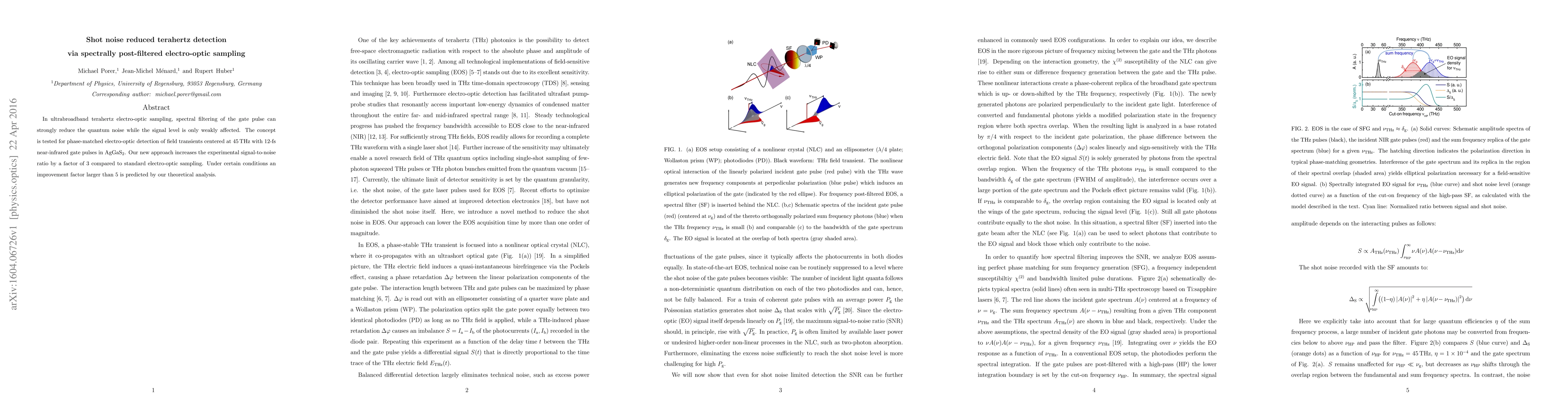 This paper presents a novel method for enhancing terahertz detection by reducing shot noise through spectral filtering of gate pulses in electro-optic sampling, achieving a threefold increase in signal-to-noise ratio in experiments and potentially over fivefold according to theoretical predictions.