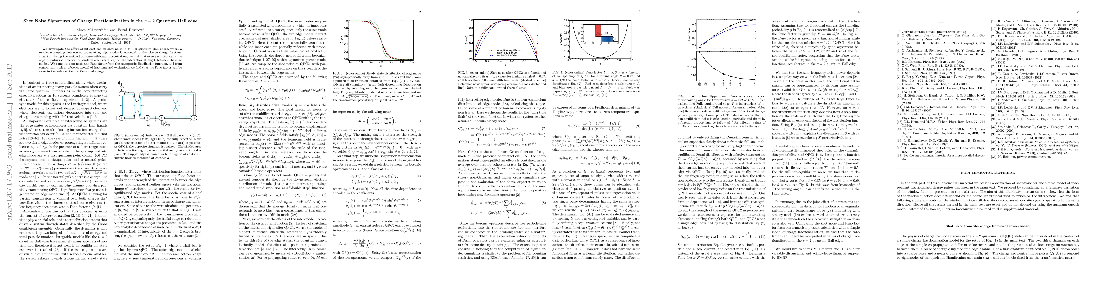 This paper examines how interactions influence shot noise in $\nu=2$ quantum Hall edges, revealing that charge fractionalization emerges due to repulsive coupling between co-propagating modes. Using non-equilibrium bosonization, the authors show that the edge distribution function is sensitive to interaction strength, and they find that the Fano factor can approximate the value of fractionalized charge.