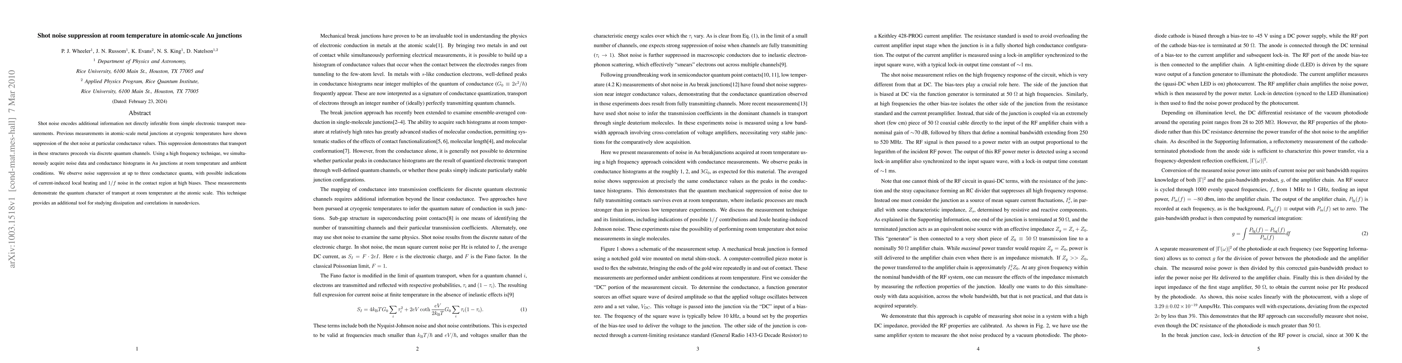 The paper reports on shot noise suppression in atomic-scale gold junctions at room temperature, revealing quantum transport behavior via discrete quantum channels, and introduces a high-frequency method for simultaneous noise and conductance measurement. The study finds quantum character in transport at ambient conditions, highlighting potential current-induced heating and $1/f$ noise effects.