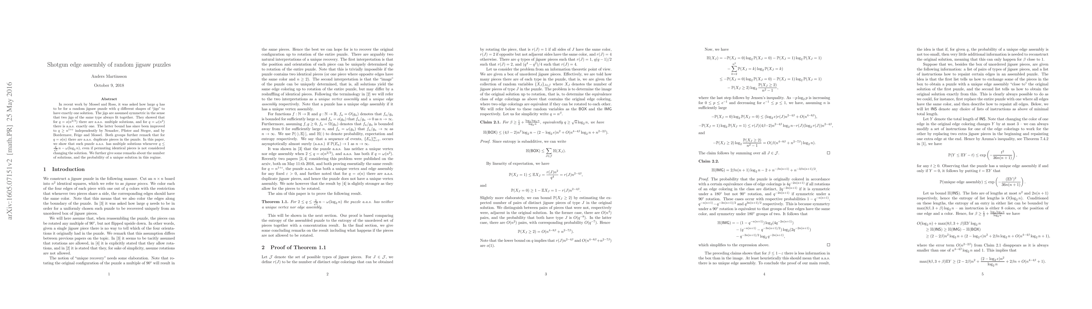 This research improves upon previous work on random jigsaw puzzles, showing that multiple solutions are almost certain when the number of jig shapes ($q$) is less than $rac{2}{sqrt{e}}n - omega(log_2 n)$. It also discusses the number of solutions and the probability of a unique solution in this regime.