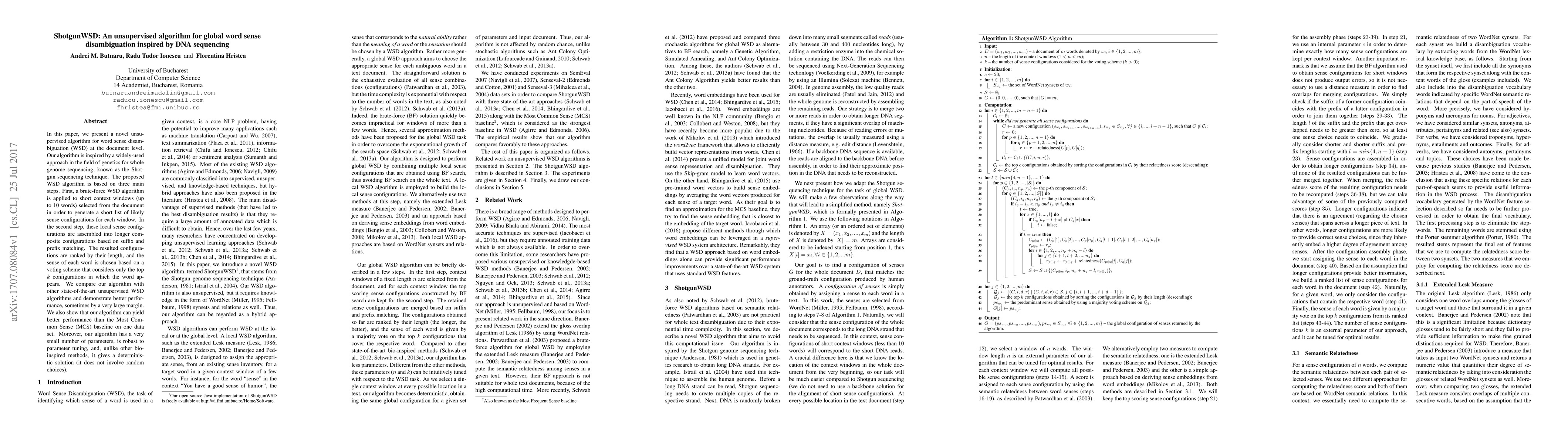 In this paper, we present a novel unsupervised algorithm for word sense disambiguation (WSD) at the document level. Our algorithm is inspired by a widely-used approach in the field of genetics for whole genome sequencing, known as the Shotgun sequencing technique. The proposed WSD algorithm is based on three main steps. First, a brute-force WSD algorithm is applied to short context windows (up to 10 words) selected from the document in order to generate a short list of likely sense configurations for each window. In the second step, these local sense configurations are assembled into longer composite configurations based on suffix and prefix matching. The resulted configurations are ranked by their length, and the sense of each word is chosen based on a voting scheme that considers only the top k configurations in which the word appears. We compare our algorithm with other state-of-the-art unsupervised WSD algorithms and demonstrate better performance, sometimes by a very large margin. We also show that our algorithm can yield better performance than the Most Common Sense (MCS) baseline on one data set. Moreover, our algorithm has a very small number of parameters, is robust to parameter tuning, and, unlike other bio-inspired methods, it gives a deterministic solution (it does not involve random choices).