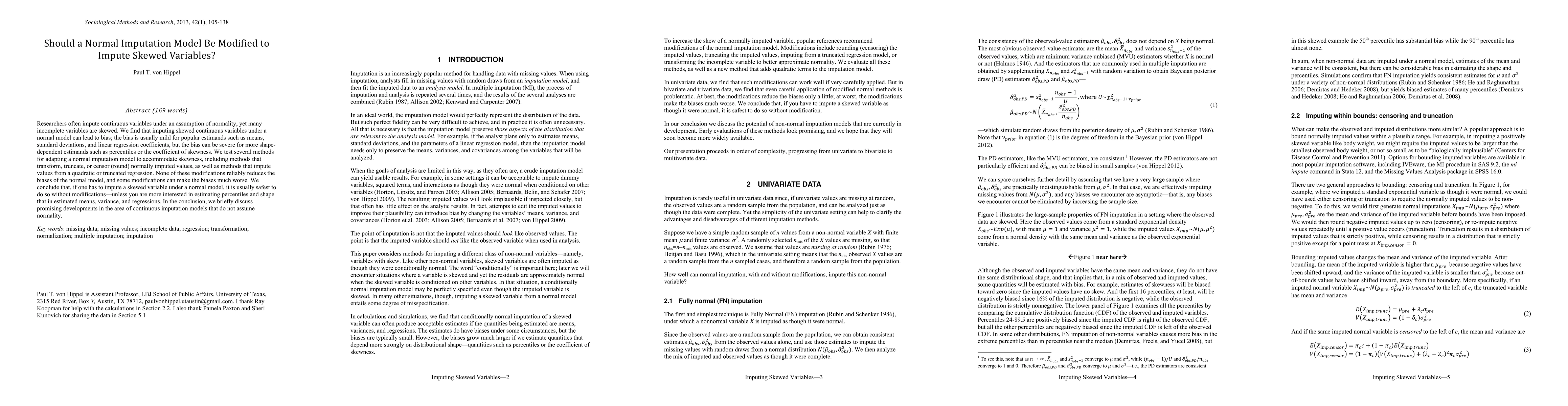 This paper examines the bias introduced by imputing skewed continuous variables under a normal model, finding that while mild for common estimates like means, it can be severe for shape-dependent measures. Various modifications to the normal model to handle skewness are tested but found ineffective, suggesting that unmodified normal imputation is safest unless specific shape-dependent estimates are prioritized.