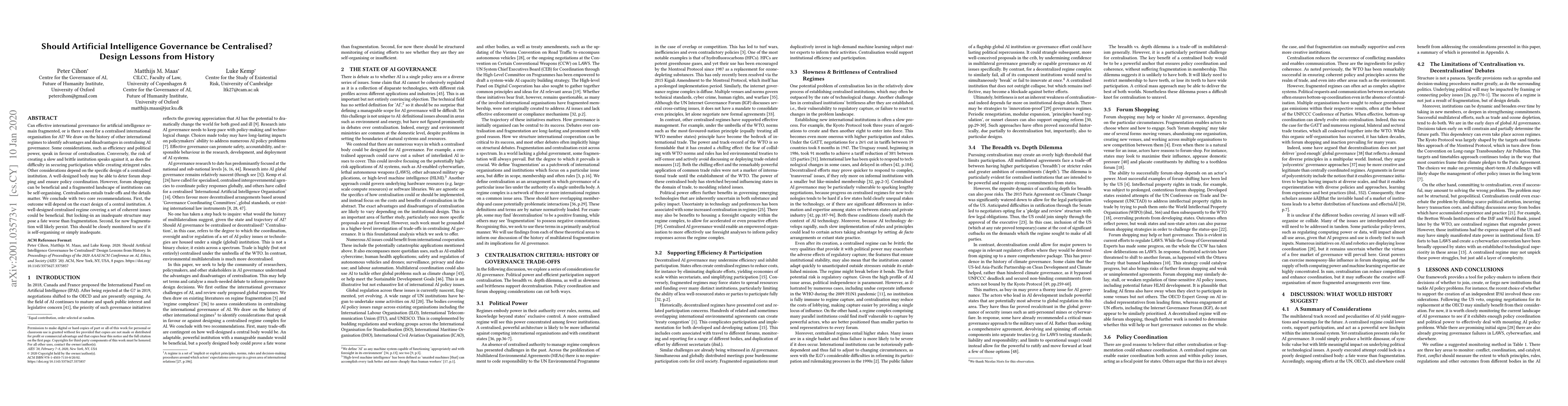 Can effective international governance for artificial intelligence remain fragmented, or is there a need for a centralised international organisation for AI? We draw on the history of other international regimes to identify advantages and disadvantages in centralising AI governance. Some considerations, such as efficiency and political power, speak in favour of centralisation. Conversely, the risk of creating a slow and brittle institution speaks against it, as does the difficulty in securing participation while creating stringent rules. Other considerations depend on the specific design of a centralised institution. A well-designed body may be able to deter forum shopping and ensure policy coordination. However, forum shopping can be beneficial and a fragmented landscape of institutions can be self-organising. Centralisation entails trade-offs and the details matter. We conclude with two core recommendations. First, the outcome will depend on the exact design of a central institution. A well-designed centralised regime covering a set of coherent issues could be beneficial. But locking-in an inadequate structure may pose a fate worse than fragmentation. Second, for now fragmentation will likely persist. This should be closely monitored to see if it is self-organising or simply inadequate.