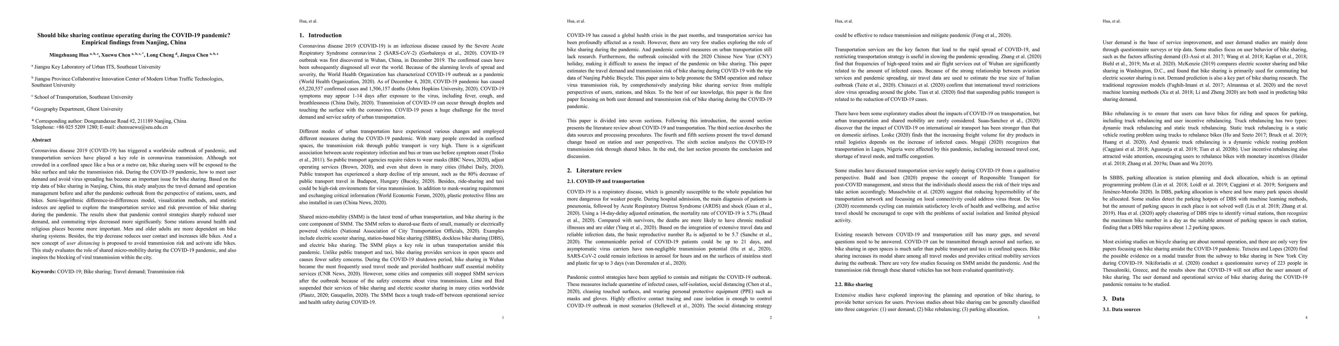 This study examines the impact of COVID-19 on bike sharing usage in Nanjing, China, revealing a significant drop in demand and commuting trips, with increased reliance on stations near health and religious sites. The research proposes a "user distancing" concept to mitigate transmission risks and utilize idle bikes.