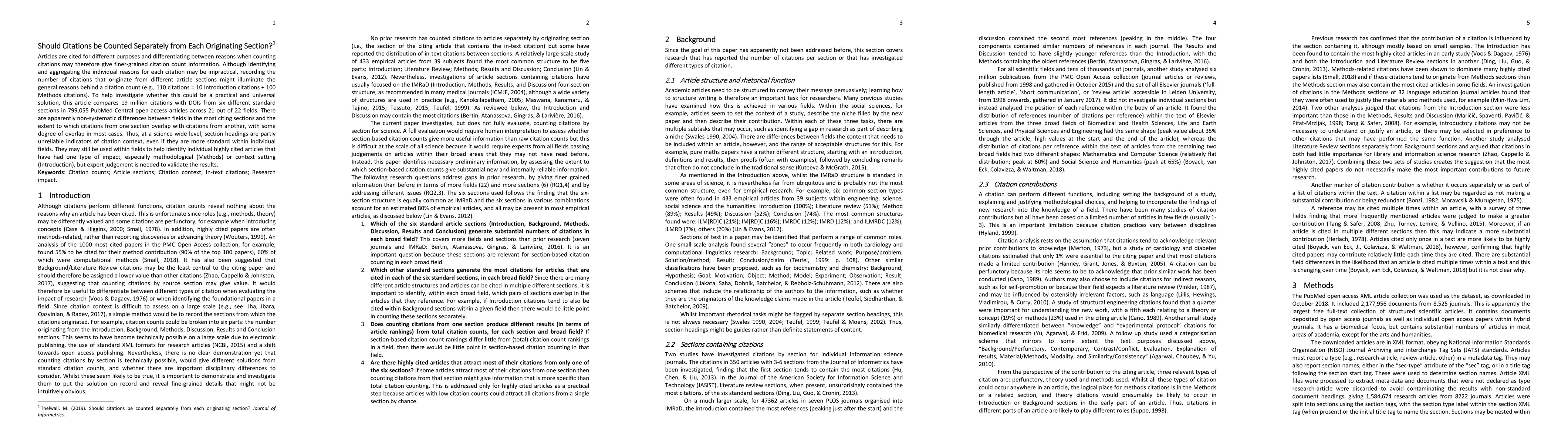 Articles are cited for different purposes and differentiating between reasons when counting citations may therefore give finer-grained citation count information. Although identifying and aggregating the individual reasons for each citation may be impractical, recording the number of citations that originate from different article sections might illuminate the general reasons behind a citation count (e.g., 110 citations = 10 Introduction citations + 100 Methods citations). To help investigate whether this could be a practical and universal solution, this article compares 19 million citations with DOIs from six different standard sections in 799,055 PubMed Central open access articles across 21 out of 22 fields. There are apparently non-systematic differences between fields in the most citing sections and the extent to which citations from one section overlap with citations from another, with some degree of overlap in most cases. Thus, at a science-wide level, section headings are partly unreliable indicators of citation context, even if they are more standard within individual fields. They may still be used within fields to help identify individual highly cited articles that have had one type of impact, especially methodological (Methods) or context setting (Introduction), but expert judgement is needed to validate the results.