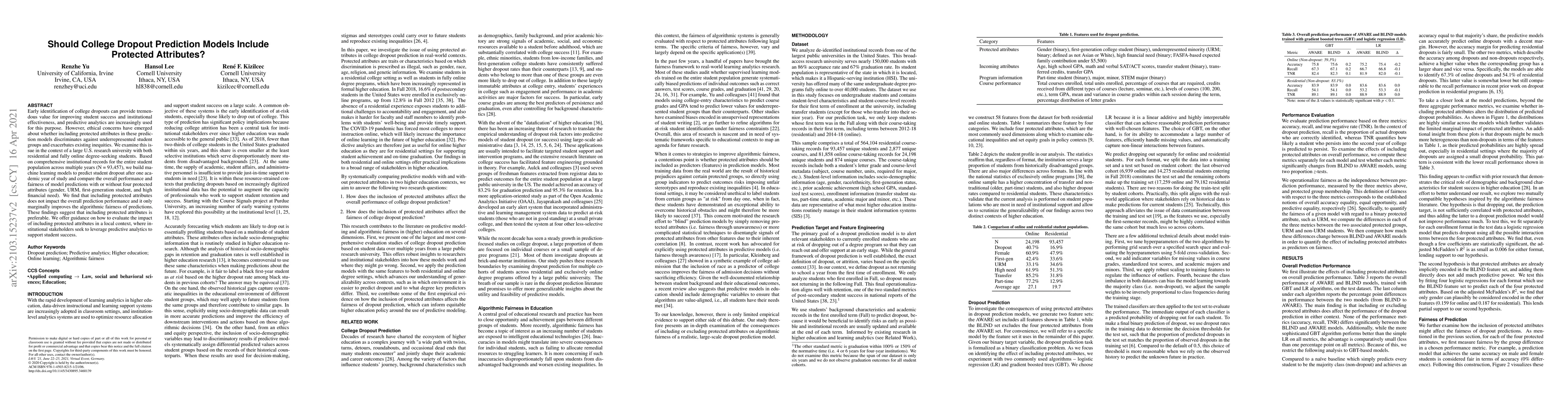 This study examines the ethical implications of using protected attributes in college dropout prediction models, finding that while including such attributes marginally improves fairness, it does not significantly affect overall prediction performance. The research provides insights for institutions aiming to use predictive analytics to enhance student success.