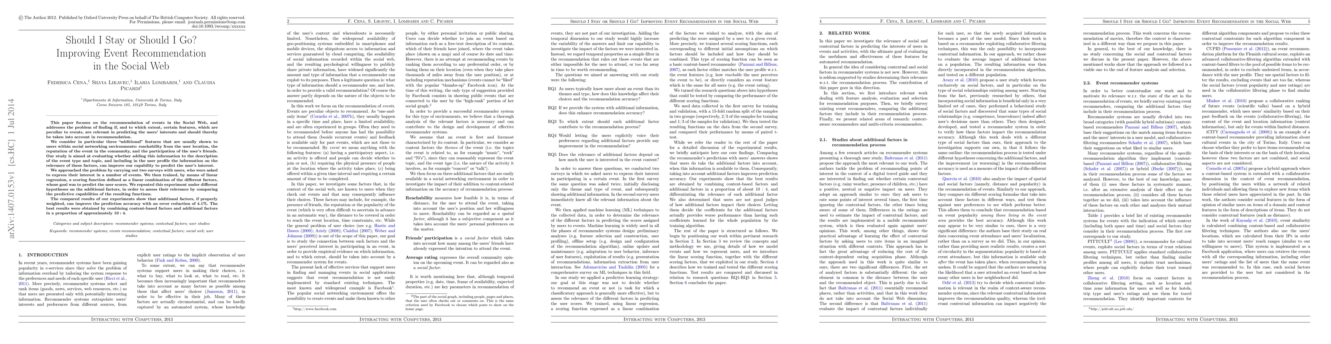 This paper focuses on the recommendation of events in the Social Web, and addresses the problem of finding if, and to which extent, certain features, which are peculiar to events, are relevant in predicting the users' interests and should thereby be taken into account in recommendation. We consider in particular three "additional" features that are usually shown to users within social networking environments: reachability from the user location, the reputation of the event in the community, and the participation of the user's friends. Our study is aimed at evaluating whether adding this information to the description of the event type and topic, and including in the user profile the information on the relevance of these factors, can improve our capability to predict the user's interest. We approached the problem by carrying out two surveys with users, who were asked to express %with a score their interest in a number of events. We then trained, by means of linear regression, a scoring function defined as a linear combination of the different factors, whose goal was to predict the user scores. We repeated this experiment under different hypotheses on the additional factors, in order to assess their relevance by comparing the predictive capabilities of the resulting functions. The compared results of our experiments show that additional factors, if properly weighted, can improve the prediction accuracy with an error reduction of 4.1%. The best results were obtained by combining content-based factors and additional factors in a proportion of approximately 10:4.