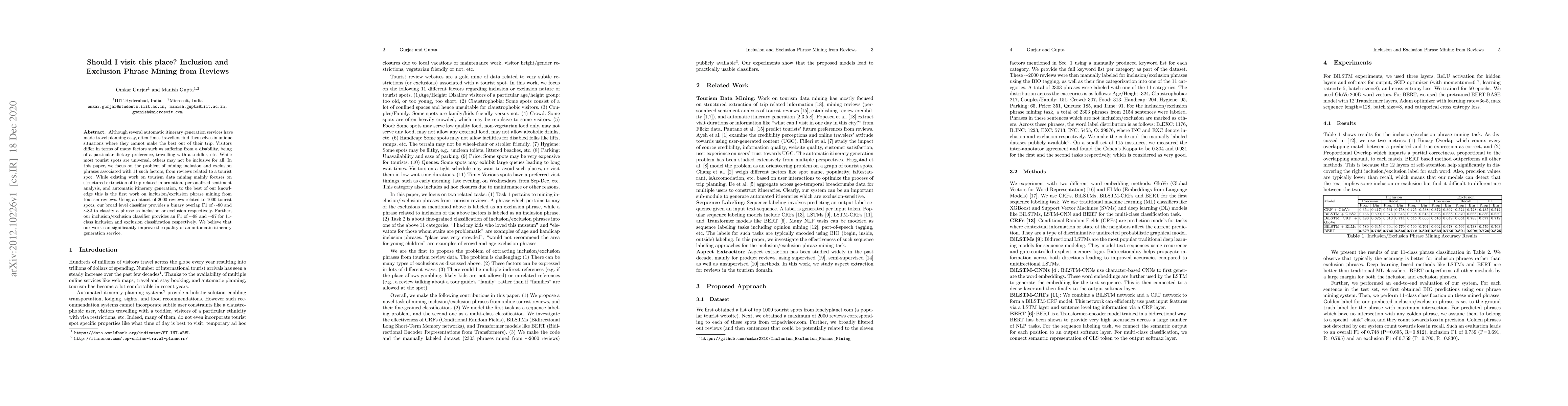 Although several automatic itinerary generation services have made travel planning easy, often times travellers find themselves in unique situations where they cannot make the best out of their trip. Visitors differ in terms of many factors such as suffering from a disability, being of a particular dietary preference, travelling with a toddler, etc. While most tourist spots are universal, others may not be inclusive for all. In this paper, we focus on the problem of mining inclusion and exclusion phrases associated with 11 such factors, from reviews related to a tourist spot. While existing work on tourism data mining mainly focuses on structured extraction of trip related information, personalized sentiment analysis, and automatic itinerary generation, to the best of our knowledge this is the first work on inclusion/exclusion phrase mining from tourism reviews. Using a dataset of 2000 reviews related to 1000 tourist spots, our broad level classifier provides a binary overlap F1 of $\sim$80 and $\sim$82 to classify a phrase as inclusion or exclusion respectively. Further, our inclusion/exclusion classifier provides an F1 of $\sim$98 and $\sim$97 for 11-class inclusion and exclusion classification respectively. We believe that our work can significantly improve the quality of an automatic itinerary generation service.