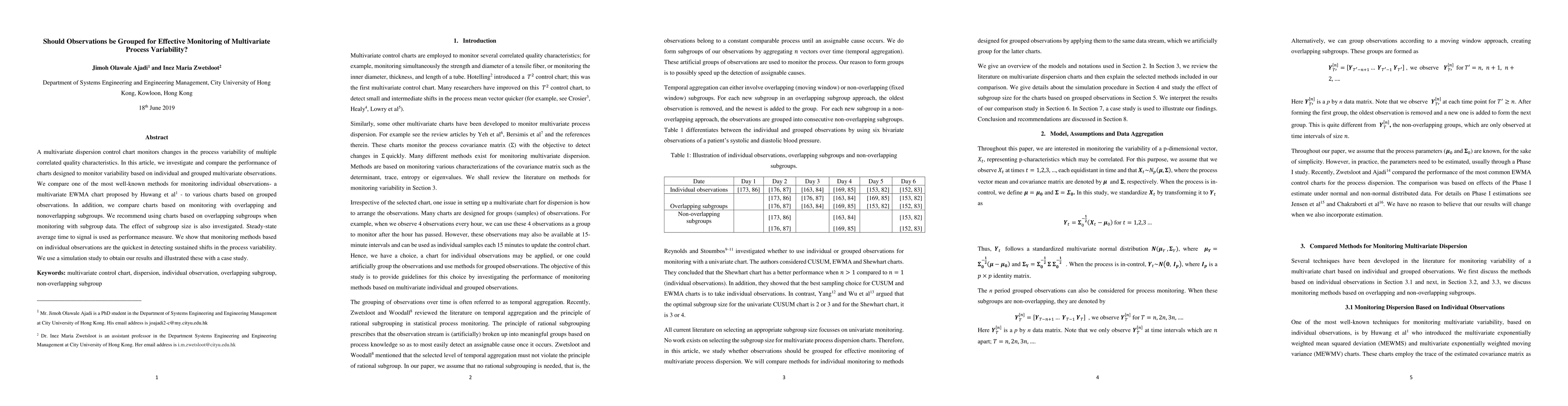 This paper compares the performance of multivariate dispersion control charts for monitoring process variability, finding that charts based on individual observations detect shifts faster than those using grouped observations. It recommends overlapping subgroups for subgroup data monitoring and investigates the effect of subgroup size, concluding with a simulation study and case study.