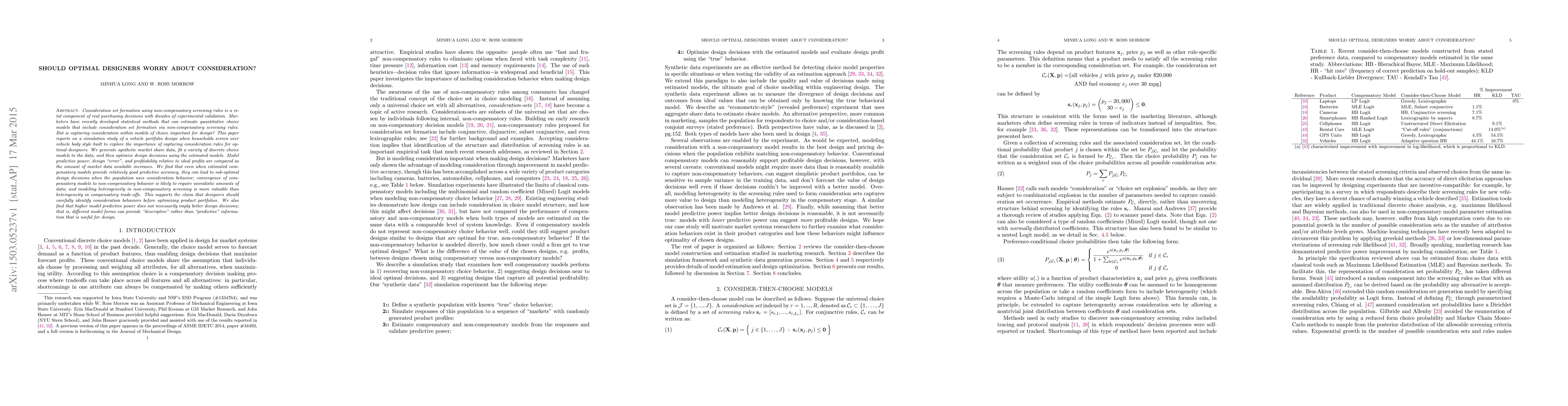 Consideration set formation using non-compensatory screening rules is a vital component of real purchasing decisions with decades of experimental validation. Marketers have recently developed statistical methods that can estimate quantitative choice models that include consideration set formation via non-compensatory screening rules. But is capturing consideration within models of choice important for design? This paper reports on a simulation study of a vehicle portfolio design when households screen over vehicle body style built to explore the importance of capturing consideration rules for optimal designers. We generate synthetic market share data, fit a variety of discrete choice models to the data, and then optimize design decisions using the estimated models. Model predictive power, design "error", and profitability relative to ideal profits are compared as the amount of market data available increases. We find that even when estimated compensatory models provide relatively good predictive accuracy, they can lead to sub-optimal design decisions when the population uses consideration behavior; convergence of compensatory models to non-compensatory behavior is likely to require unrealistic amounts of data; and modeling heterogeneity in non-compensatory screening is more valuable than heterogeneity in compensatory trade-offs. This supports the claim that designers should carefully identify consideration behaviors before optimizing product portfolios. We also find that higher model predictive power does not necessarily imply better design decisions; that is, different model forms can provide "descriptive" rather than "predictive" information that is useful for design.