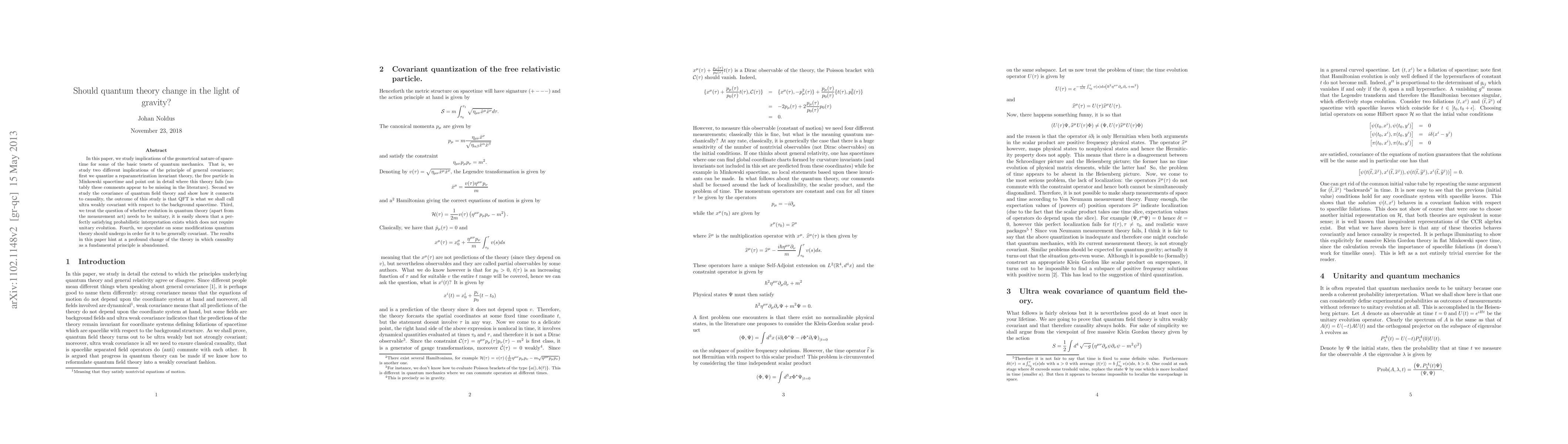 In this paper, we study implications of the geometrical nature of space- time for some of the basic tenets of quantum mechanics. That is, we study two different implications of the principle of general covariance; first we quantize a reparametrization invariant theory, the free particle in Minkowski spacetime and point out in detail where this theory fails (no- tably these comments appear to be missing in the literature). Second we study the covariance of quantum field theory and show how it connects to causality, the outcome of this study is that QFT is what we shall call ultra weakly covariant with respect to the background spacetime. Third, we treat the question of whether evolution in quantum theory (apart from the measurement act) needs to be unitary, it is easily shown that a per- fectly satisfying probabilistic interpretation exists which does not require unitary evolution. Fourth, we speculate on some modifications quantum theory should undergo in order for it to be generally covariant. The results in this paper hint at a profound change of the theory in which causality as a fundamental principle is abandonned.