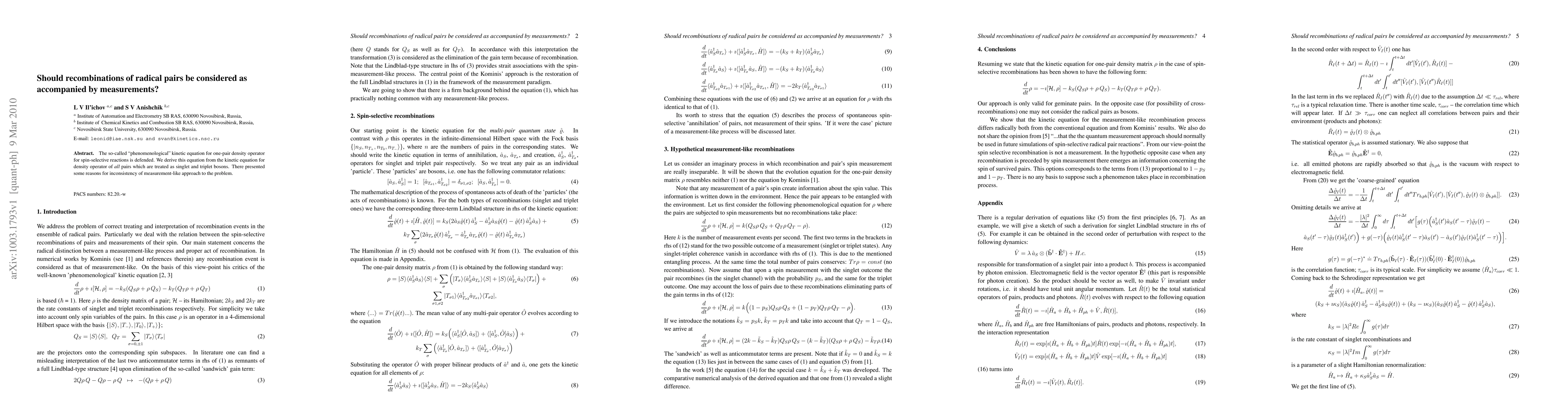 The so-called "phenomenological" kinetic equation for one-pair density operator for spin-selective reactions is defended. We derive this equation from the kinetic equation for density operator of all pairs which are treated as singlet and triplet bosons. There presented some reasons for inconsistency of measurement-like approach to the problem.
