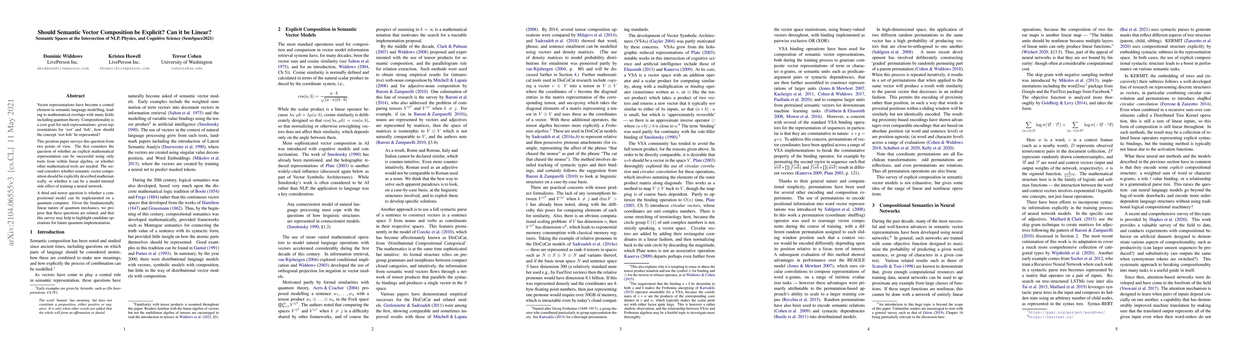 Vector representations have become a central element in semantic language modelling, leading to mathematical overlaps with many fields including quantum theory. Compositionality is a core goal for such representations: given representations for 'wet' and 'fish', how should the concept 'wet fish' be represented? This position paper surveys this question from two points of view. The first considers the question of whether an explicit mathematical representation can be successful using only tools from within linear algebra, or whether other mathematical tools are needed. The second considers whether semantic vector composition should be explicitly described mathematically, or whether it can be a model-internal side-effect of training a neural network. A third and newer question is whether a compositional model can be implemented on a quantum computer. Given the fundamentally linear nature of quantum mechanics, we propose that these questions are related, and that this survey may help to highlight candidate operations for future quantum implementation.