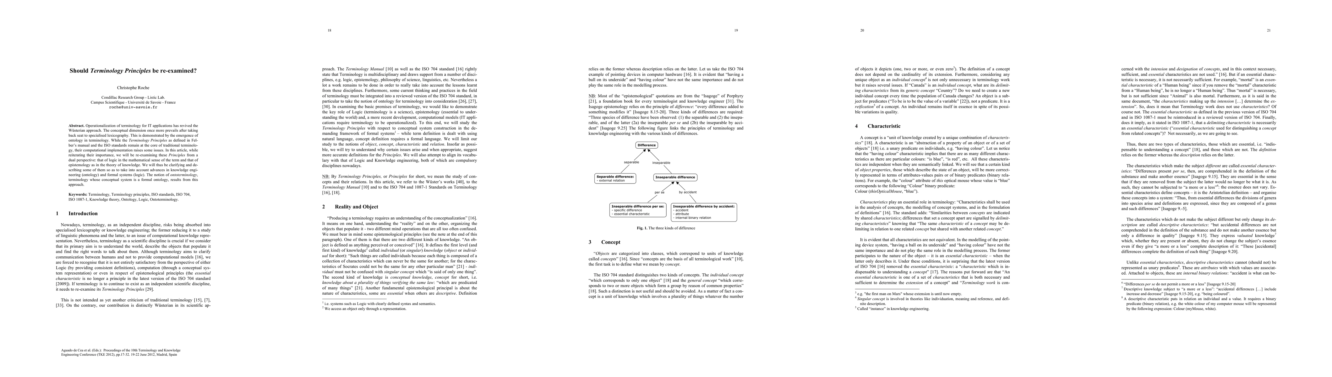 Operationalization of terminology for IT applications has revived the Wusterian approach. The conceptual dimension once more prevails after taking back seat to specialised lexicography. This is demonstrated by the emergence of ontology in terminology. While the Terminology Principles as defined in Felber manual and the ISO standards remain at the core of traditional terminology, their computational implementation raises some issues. In this article, while reiterating their importance, we will be re-examining these Principles from a dual perspective: that of logic in the mathematical sense of the term and that of epistemology as in the theory of knowledge. We will thus be clarifying and describing some of them so as to take into account advances in knowledge engineering (ontology) and formal systems (logic). The notion of ontoterminology, terminology whose conceptual system is a formal ontology, results from this approach.